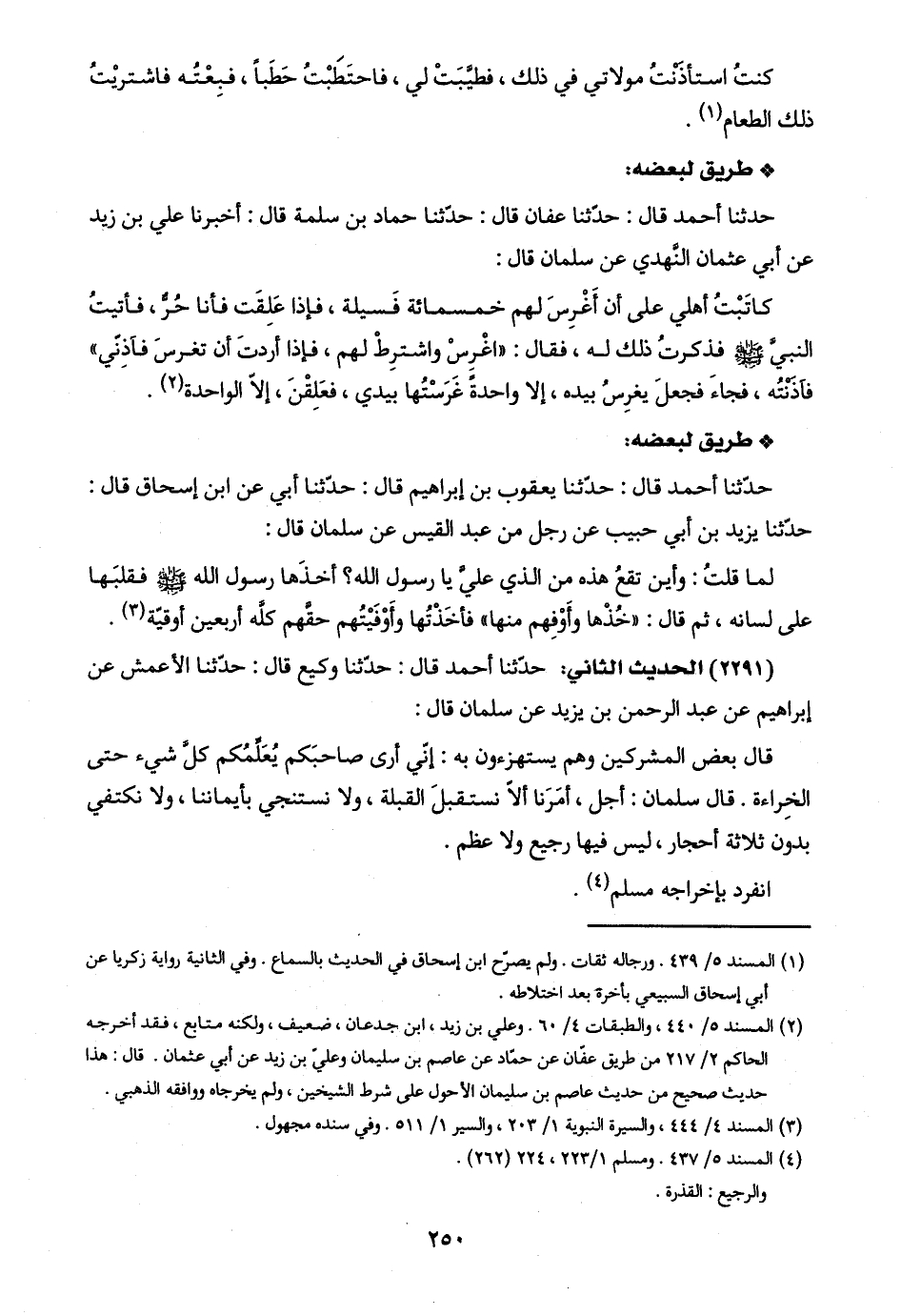 حدّثنا أحمد قال: حدّثنا يعقوب بن إبراهيم قال: حدّثنا أبي عن ابن إسحاق قال: حدّثنا يزيد بن أبي حبيب عن رجل من عبد القيس عن سلمان قال: