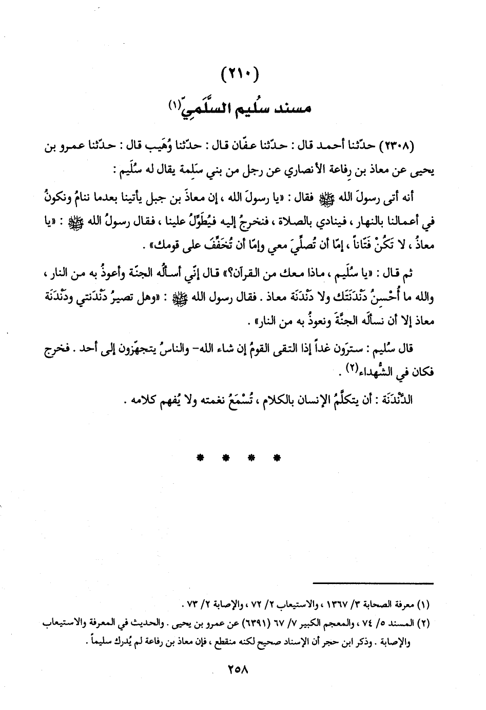 (٢٣٠٨) حدّثنا أحمد قال: حدّثنا عفّان قال: حدّثنا وُهَيب قال: حدّثنا عمرو بن يحيى عن معاذ بن رِفاعة الأنصاري عن رجل من بني سَلِمة يقال له سُلَيم: