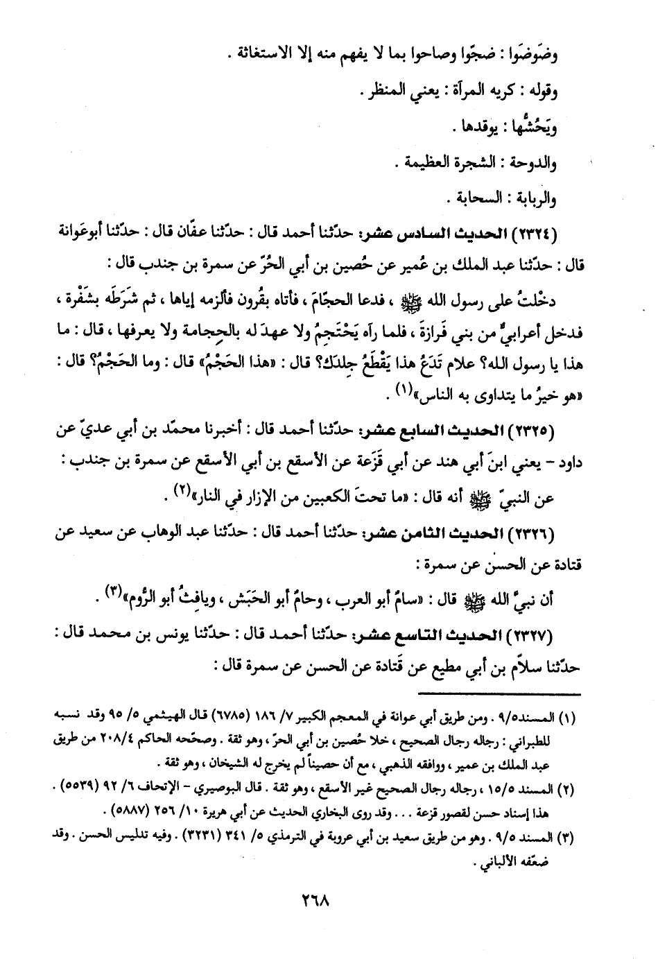 (٢٣٢٤) الحديث السادس عشر: حدّثنا أحمد قال: حدّثنا عفّان قال: حدّثنا أبو عَوانة قال: حدّثنا عبد الملك بن عُمير عن حُصين بن أبي الحُرّ عن سمرة بن جندب قال: