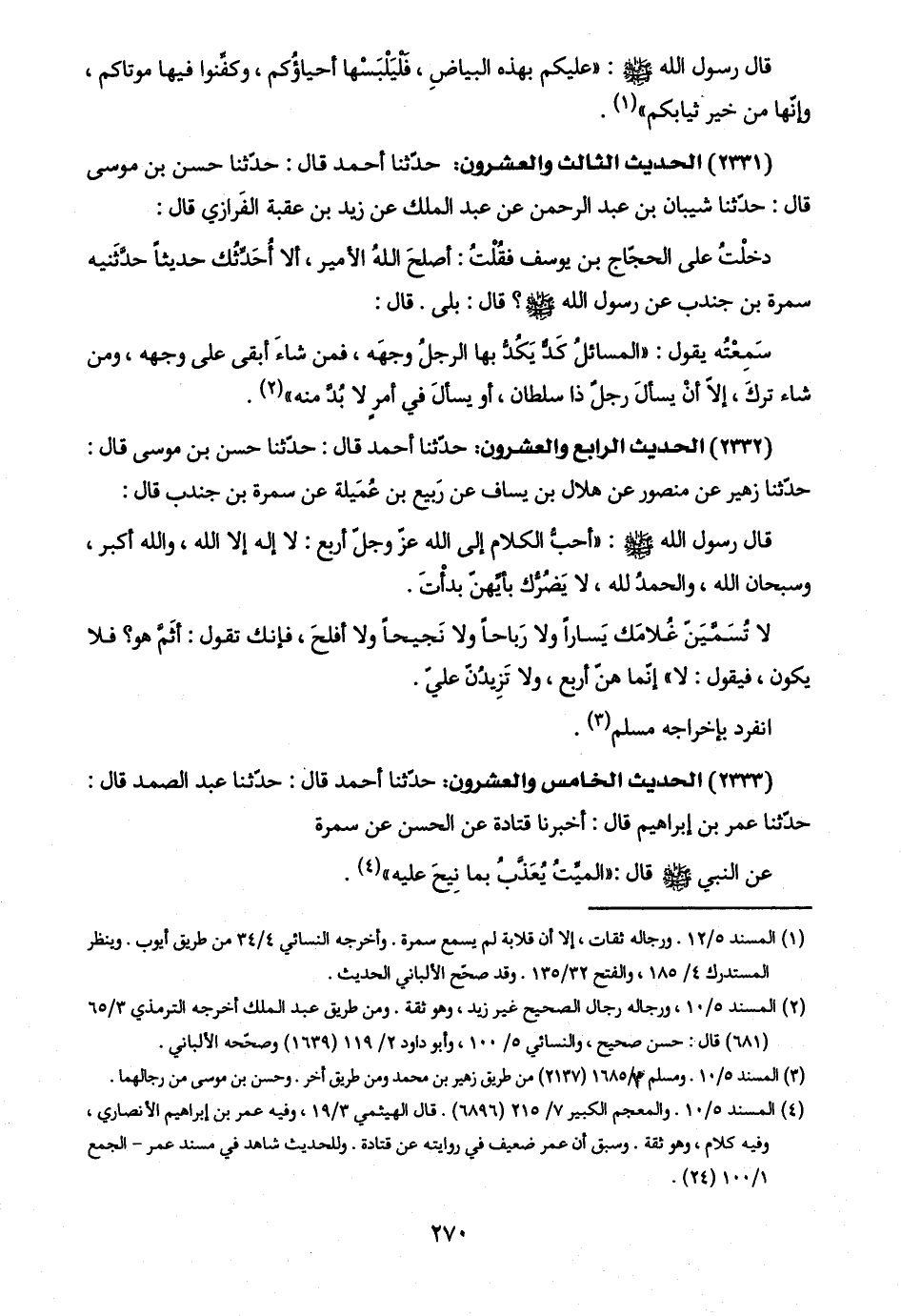 (٢٣٣٢) الحديث الرابع والعشرون: حدّثنا أحمد قال: حدّثنا حسن بن موسى قال: حدّثنا زهير عن منصور عن هلال بن يساف عن رَبيع بن عُمَيلة عن سمرة بن جندب قال: