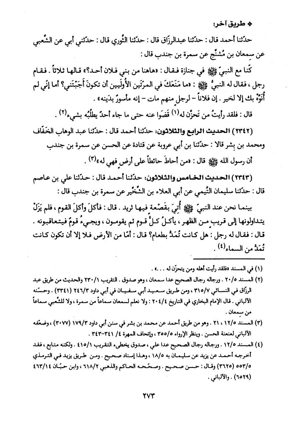 (٢٣٤٢) الحديث الرابع والثلاثون: حدّثنا أحمد قال: حدّثنا عبد الوهاب الخَفّاف ومحمد بن بِشر قالا: حدّثنا بن أبي عروبة عن قتادة عن الحسن عن سمرة بن جندب: