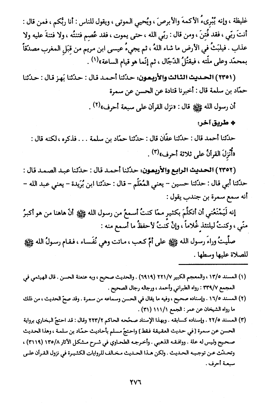 (٢٣٥٢) الحديث الرابع والأربعون: حدّثنا أحمد قال: حدّثنا عبد الصمد قال: حدّثنا أبي قال: حدّثنا حسين -يعني المُعَلّم- قال: حدّثنا ابن بُرَيدة -يعني عبد اللَّه- أنّه سمع سمرة بن جندب يقول: