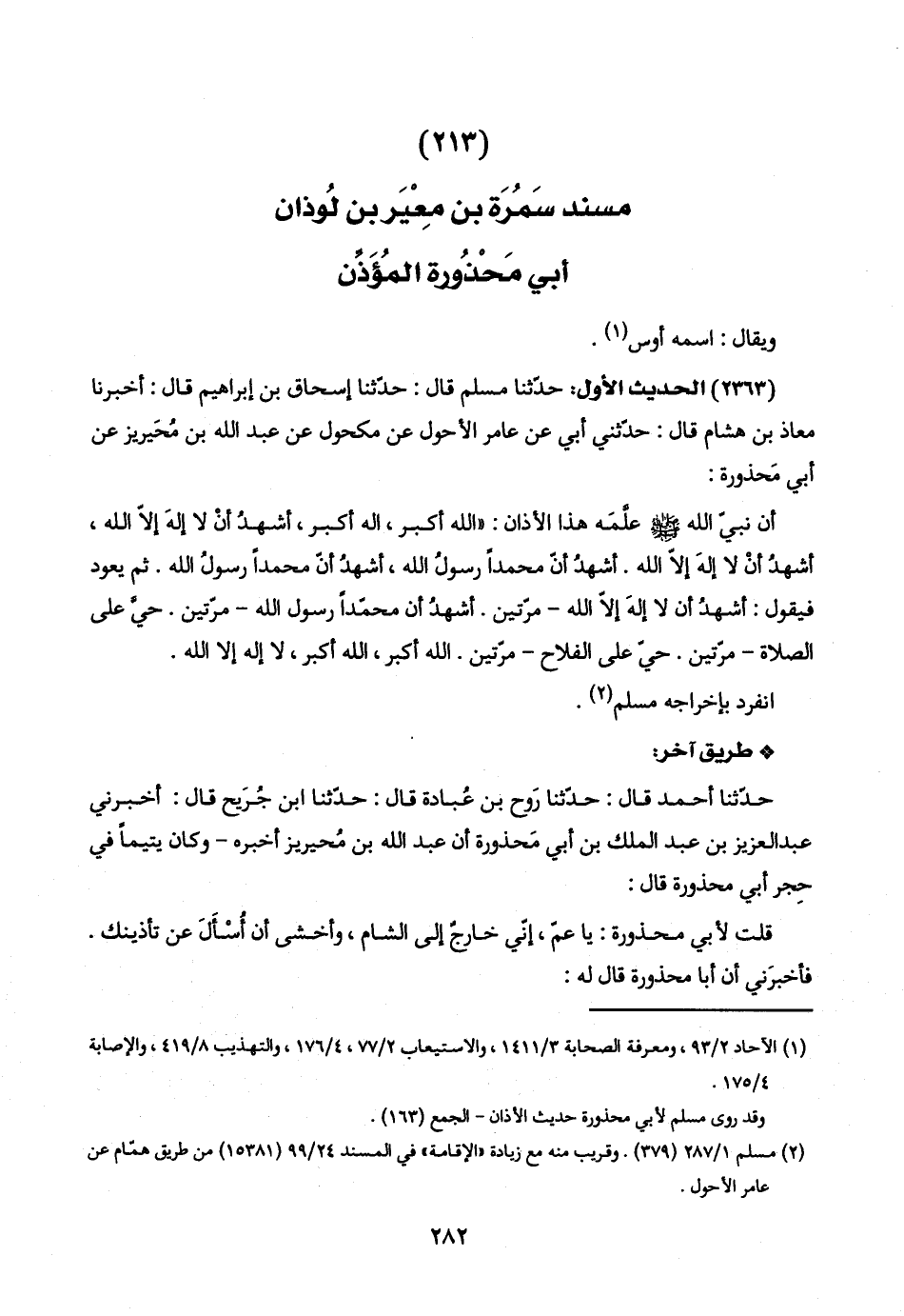 (٢١٣) مسند سَمُرَة بن مِعْيَر بن لُوذان أبي مَحْذُورة المُؤَذِّن