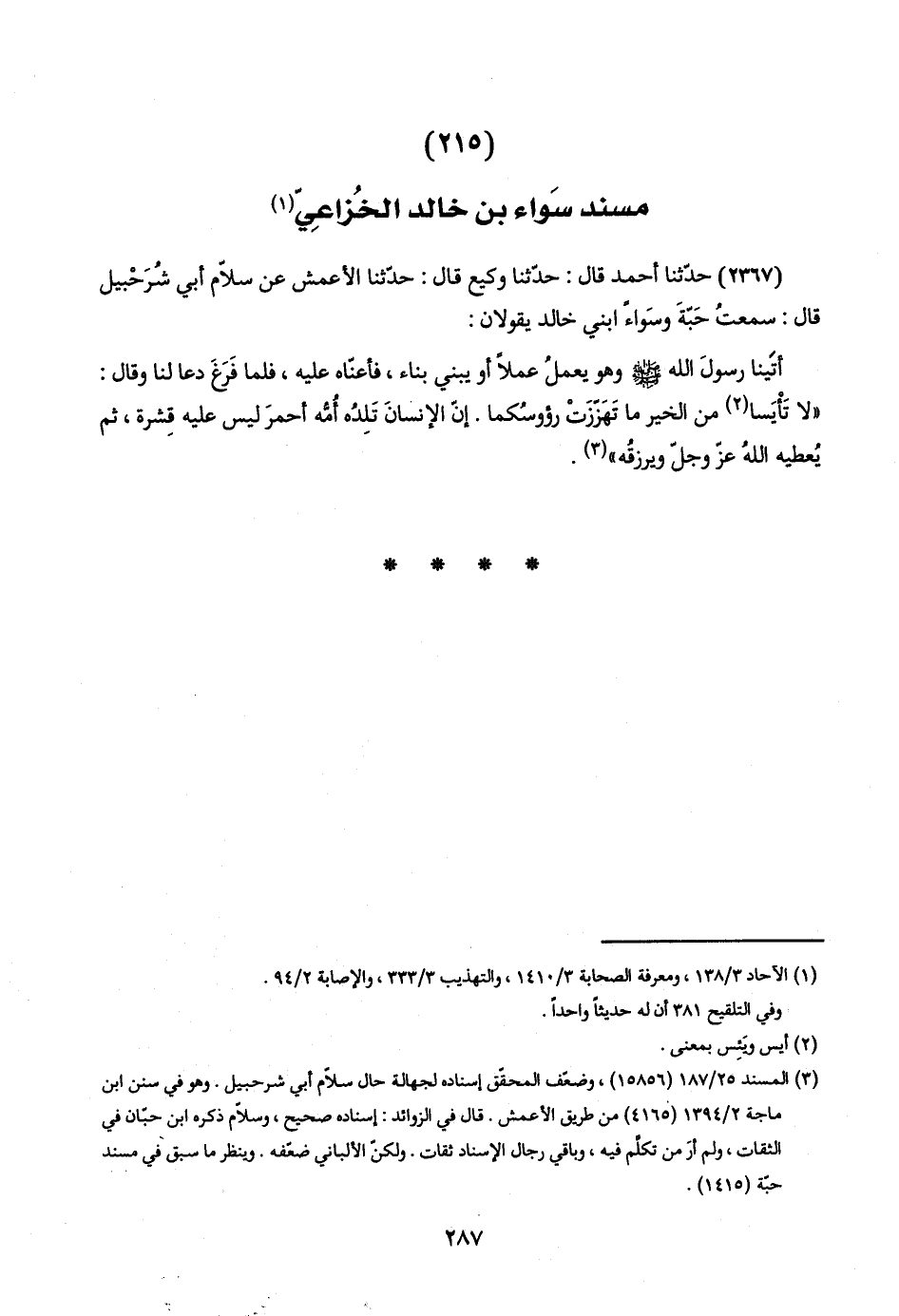(٢٣٦٧) حدّثنا أحمد قال: حدّثنا وكيع قال: حدّثنا الأعمش عن سلّام أبي شُرَحْبيل قال: سمعتُ حَبّةَ وسَواءً ابني خالد يقولان: