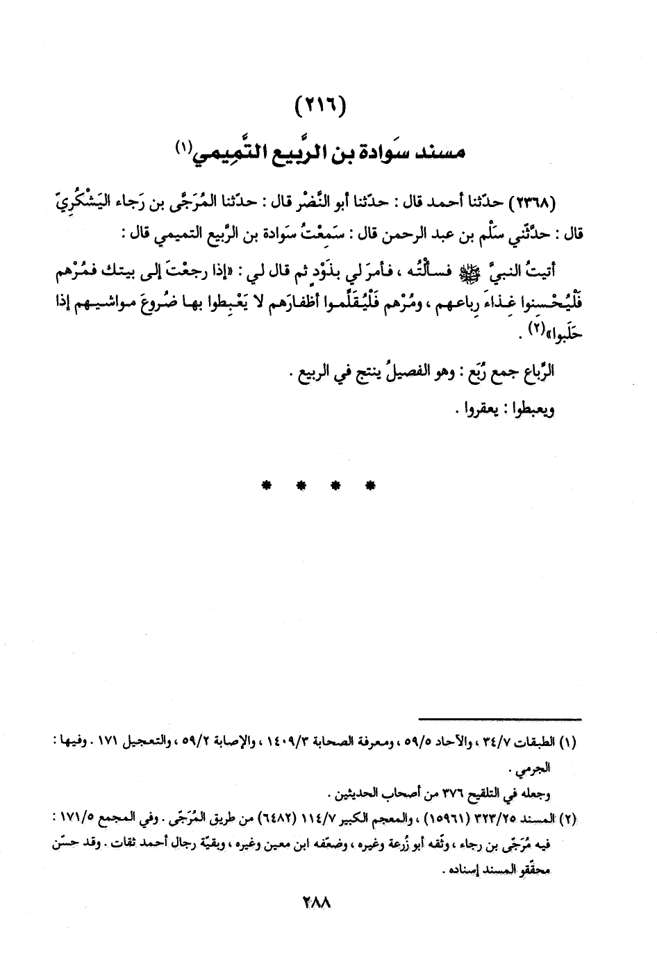(٢٣٦٨) حدّثنا أحمد قال: حدّثنا أبو النَّضْر قال: حدّثنا المُرَجَّي بن رَجاء اليَشْكُرِيّ قال: حدَّثني سَلْم بن عبد الرحمن قال: سَمِعْتُ سَوادة بن الرَّبيع التميمي قال:
