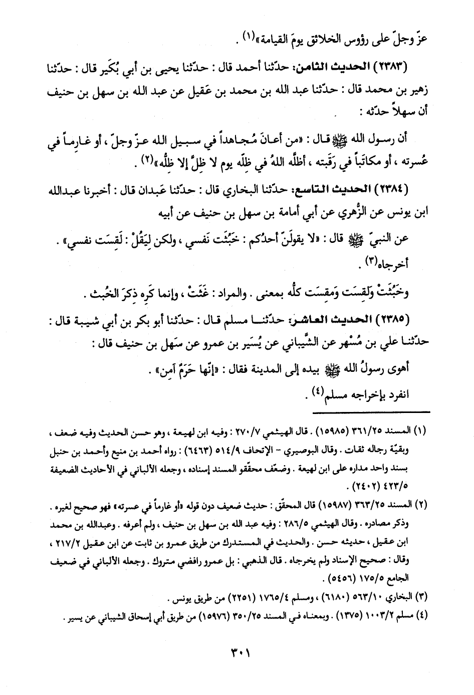 (٢٣٨٣) الحديث الثامن: حدّثنا أحمد قال: حدّثنا يحيى بن أبي بُكَير قال: حدّثنا زهير بن محمد قال: حدّثنا عبد اللَّه بن محمد بن عَقيل عن عبد اللَّه بن سهل بن حنيف أن سهلًا حدّثه:
