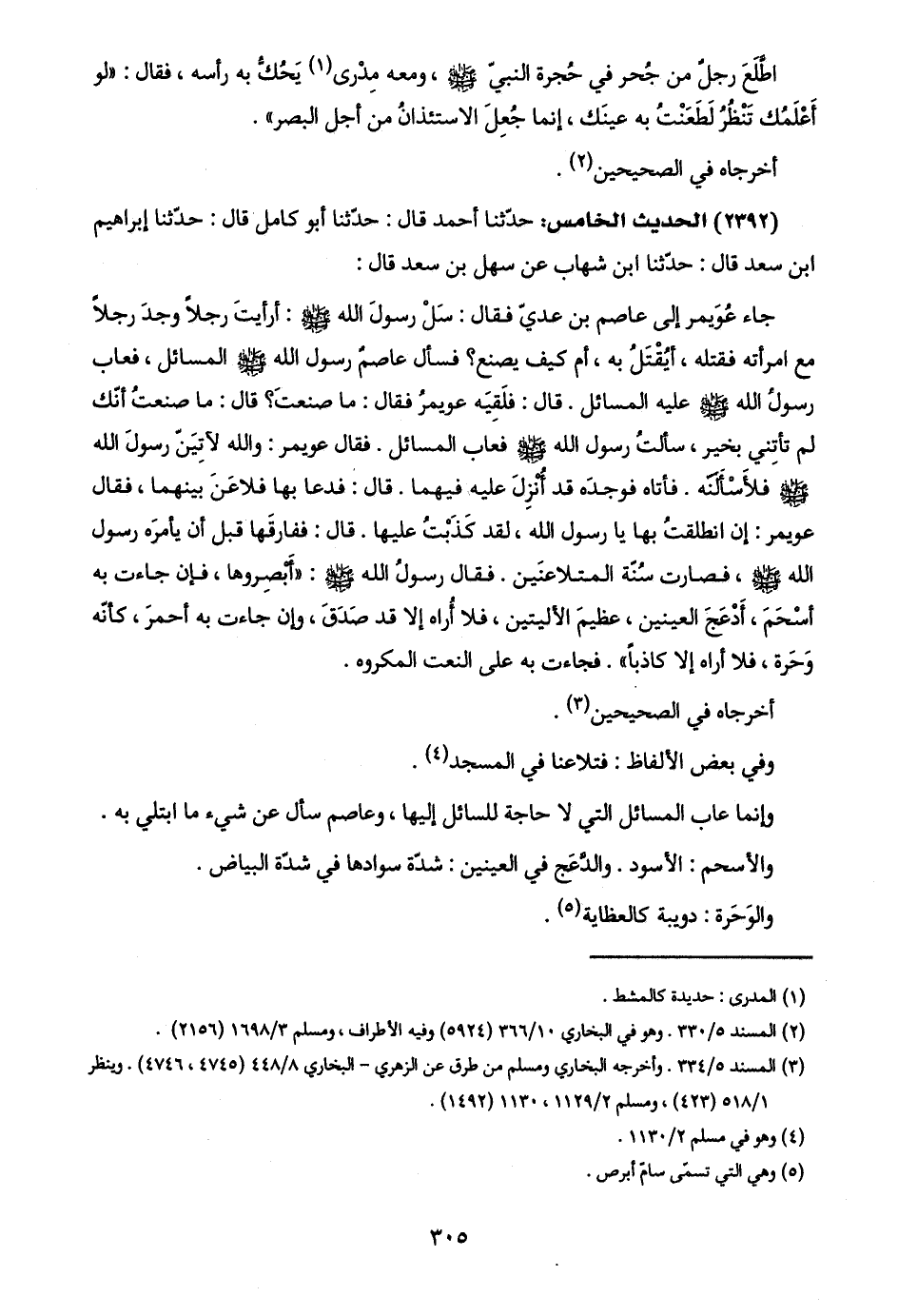 جاء عُوَيمر إلى عاصم بن عديّ فقال: سَلْ رسولَ اللَّه -صلى اللَّه عليه وسلم-: أرأيتَ رجلًا وجدَ رجلًا مع امرأته فقتله، أيُقْتَلُ به، أم كيف يصنع؟ فسأل عاصمٌ رسول اللَّه -صلى اللَّه عليه وسلم- المسائل، فعاب رسولُ اللَّه -صلى اللَّه عليه وسلم- عليه المسائل. قال: فلَقِيَه عويمرُ فقال: ما صنعتَ؟ قال: ما صنعتُ أنّك لم تأتِني بخير، سألتُ رسول اللَّه -صلى اللَّه عليه وسلم- فعاب المسائل. فقال عويمر: واللَّه لآتِيَنّ رسولَ اللَّه -صلى اللَّه عليه وسلم- فلأَسْأَلَنَه. فأتاه فوجدَه قد أُنْزِلَ عليه فيهما. قال: فدعا بها فلاعَنَ بينهما، فقال عويمر: إن انطلقتُ بها يا رسول اللَّه، لقد كَذَبْتُ عليها. قال: ففارقَها قبل أن يأمرَه رسول اللَّه -صلى اللَّه عليه وسلم-، فصارت سُنّة المتلاعنَين. فقال رسولُ اللَّه -صلى اللَّه عليه وسلم-: "أَبْصِروها، فإن جاءت به أسْحَمَ، أَدْعَجَ العينين، عظيمَ الأليتين، فلا أُراه إلا قد صَدَقَ، وإن جاءت به أحمرَ، كأنّه وَحَرة، فلا أراه إلا كاذبًا". فجاءت به على النعت المكروه.
