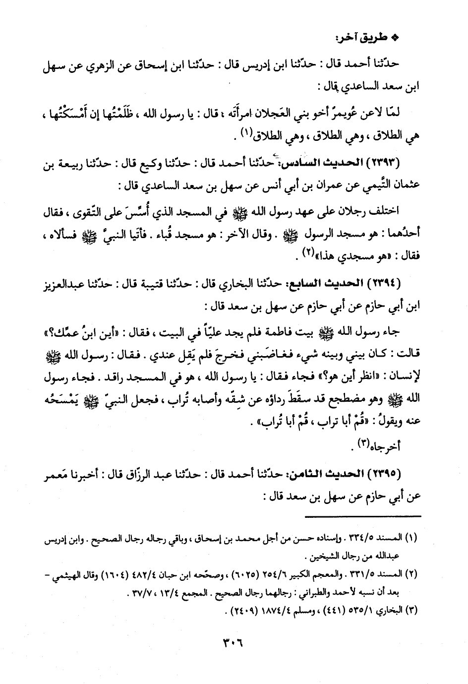 (٢٣٩٣) الحديث السادس: حدّثنا أحمد قال: حدّثنا وكيع قال: حدّثنا ربيعة بن عثمان التَّيمي عن عمران بن أبي أنس عن سهل بن سعد الساعدي قال: