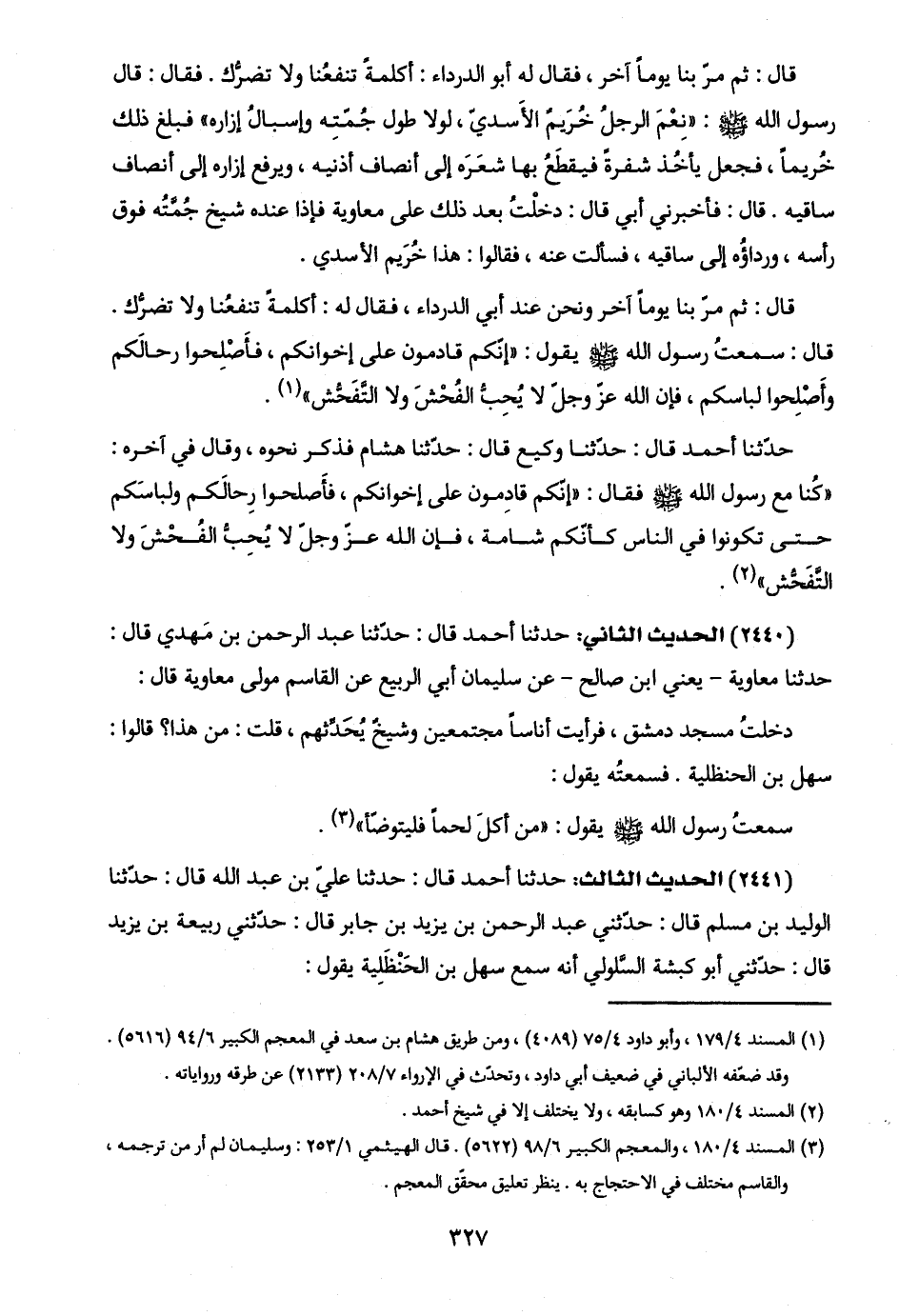 (٢٤٤١) الحديث الثالث: حدّثنا أحمد قال: حدّثنا عليّ بن عبد اللَّه قال: حدّثنا الوليد بن مسلم قال: حدّثني عبد الرحمن بن يزيد بن جابر قال: حدّثني ربيعة بن يزيد قال: حدّثني أبو كبشة السَّلولي أنّه سمع سهل بن الحَنْظَلِية يقول: