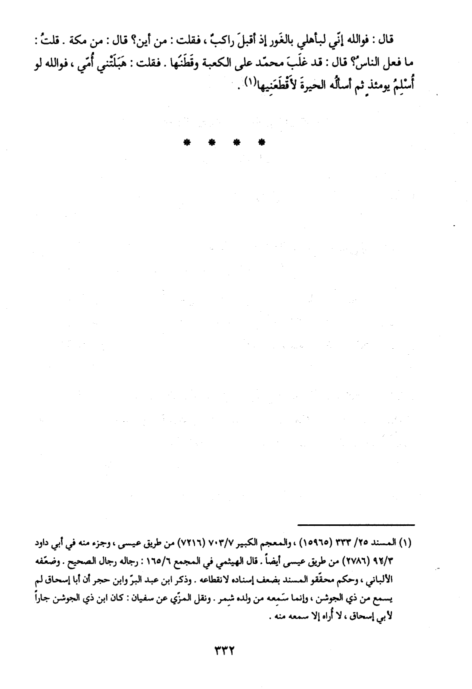 قال: فواللَّه إنّي لبأهلي بالغَور إذ أقبلَ راكبٌ، فقلت: من أين؟ قال: من مكة. قلتُ: ما فعل الناسُ؟ قال: قد غلَبَ محمّد على الكعبة وقَطَنَها. فقلت: هَبَلَتْني أُمّي، فواللَّه لو أُسْلِمُ يومئذٍ أسأُله الحيرة لأَقْطعَنِيها (١).