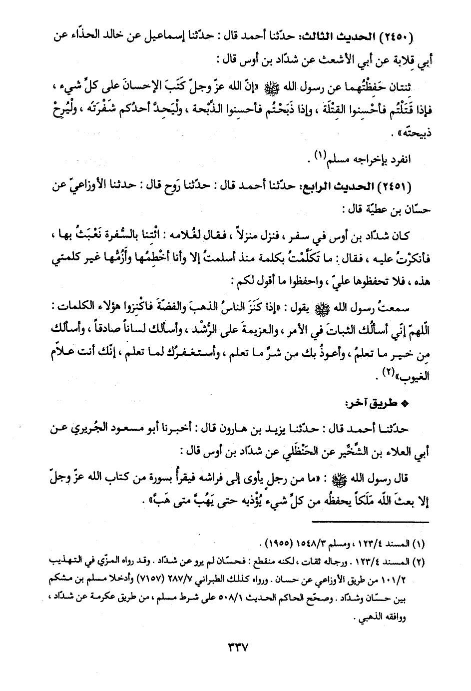 (٢٤٥٠) الحديث الثالث: حدّثنا أحمد قال: حدّثنا إسماعيل عن خالد الحذّاء عن أبي قِلابة عن أبي الأشعث عن شدّاد بن أوس قال: