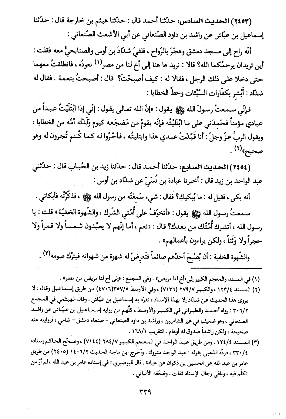 (٢٤٥٤) الحديث السابع: حدّثنا أحمد قال: حدّثنا زيد بن الحُباب قال: حدّثني عبد الواحد بن زيد قال: أخبرنا عبادة بن نُسَيّ عن شدّاد بن أوس: