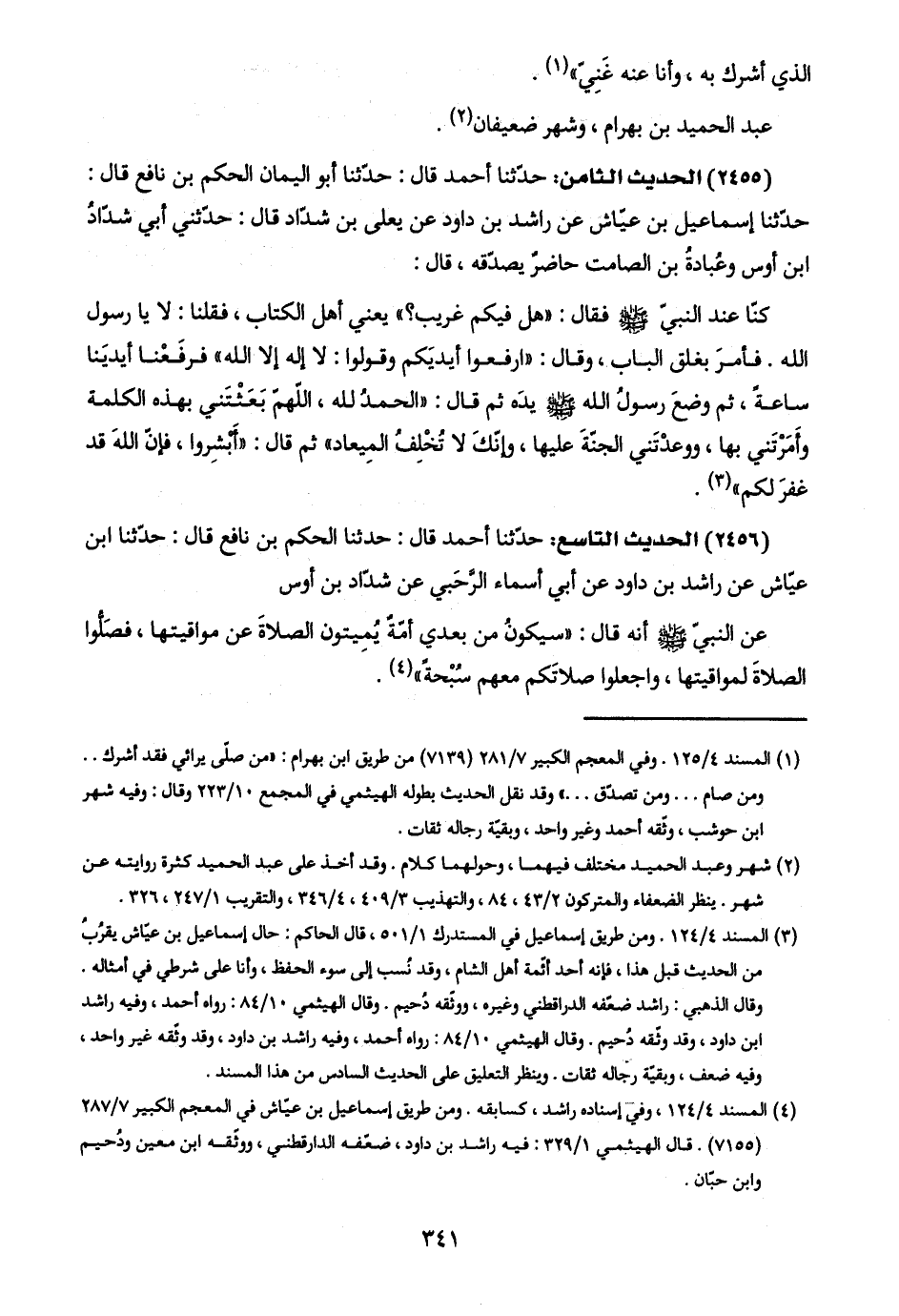 (٢٤٥٦) الحديث التاسع: حدّثنا أحمد قال: حدّثنا الحكم بن نافع قال: حدّثنا ابن عيّاش عن راشد بن داود عن أبي أسماء الرَّحَبي عن شدّاد بن أوس: