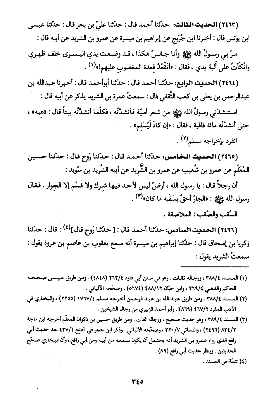 (٢٤٦٥) الحديث الخامس: حدّثنا أحمد قال: حدّثنا رَوح قال: حدّثنا حسين المُعَلّم عن عمرو بن شُعيب عن عمرو بن الشَّريد عن أبيه الشَّريد بن سُويد: