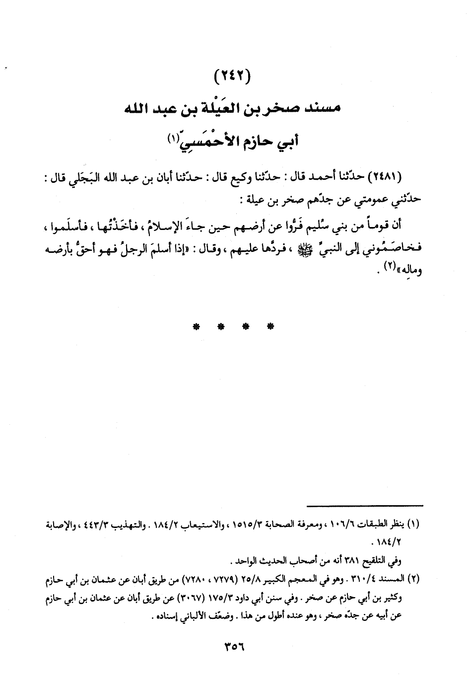 (٢٤٨١) حدّثنا أحمد قال: حدّثنا وكيع قال: حدّثنا أبان بن عبد اللَّه البَجَلي قال: حدّثني عمومتي عن جدّهم صخر بن عيلة: