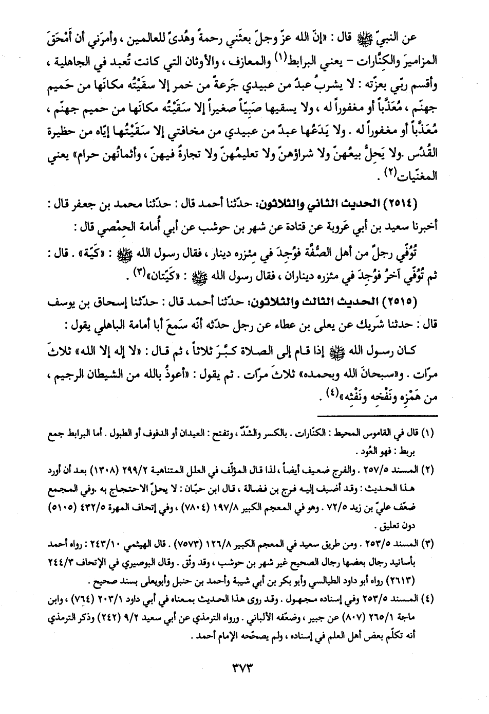 عن النبيّ -صلى اللَّه عليه وسلم-قال: "إنّ اللَّه عزّ وجلّ بعثَني رحمةً وهُدًى للعالمين، وأمرَني أن أَمْحَقَ المزاميرَ والكِنَّارات - يعني البرابط (١) والمعازف، والأوثان التي كانت تُعبد في الجاهلية، وأقسم ربّي بعزّته: لا يشربُ عبدٌ من عبيدي جَرعةً من خمر إلا سقَيْتُه مكانَها من حَميم جهنّم، مُعَذَّبًا أو مغفورًا له، ولا يسقيها صَبِيًّا صغيرًا إلا سَقَيْتُه مكانَها من حميم جهنّم، مُعَذَّبًا أو مغفورًا له. ولا يَدَعُها عبدٌ من عبيدي من مخافتي إلا سَقَيْتُها إيّاه من حظيرة القُدُس. ولا يَحلُّ بيعُهنّ ولا شراؤهنّ ولا تعليمُهنّ ولا تجارةٌ فيهنّ، وأثمانُهن حرام" يعني المغنيات (٢).