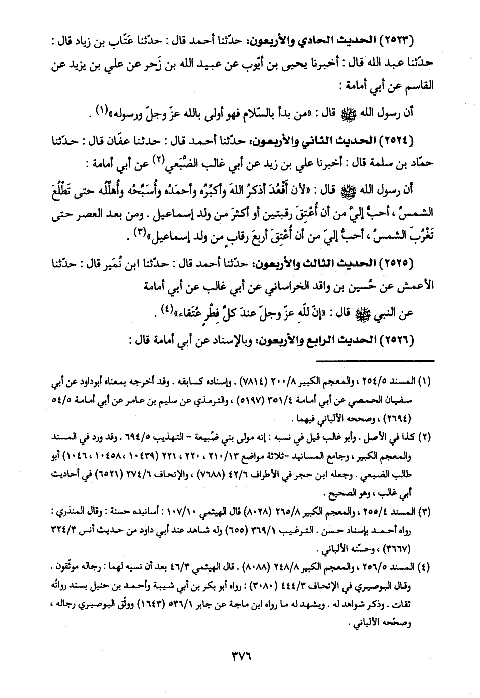 (٢٥٢٤) الحديث الثاني والأربعون: حدّثنا أحمد قال: حدّثنا عفّان قال: حدّثنا حمّاد بن سلمة قال: أخبرنا علي بن زيد عن أبي غالب الضُّبَعي (٢) عن أبي أمامة: