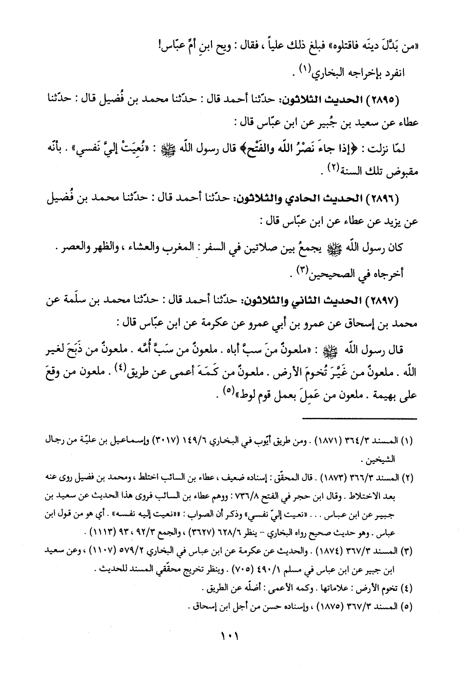 (٢) المسند ٣/ ٣٦٦ (١٨٧٣). قال المحقّق: إسناده ضعيف، عطاء بن السائب اختلط، ومحمد بن فضيل روى عنه بعد الاختلاط. وقال ابن حجر في الفتح ٨/ ٧٣٦: ووهم عطاء بن السائب فروى هذا الحديث عن سعيد بن جبير عن ابن عباس. . . "نعيت إليّ نفسي" وذكر أن الصواب: "نعيت إليه نفسه". أي هو من قول ابن عباس. وهو حديث صحيح رواه البخاري - ينظر ٦/ ٦٢٨ (٣٦٢٧)، والجمع ٣/ ٩٢، ٩٣ (١١١٣).