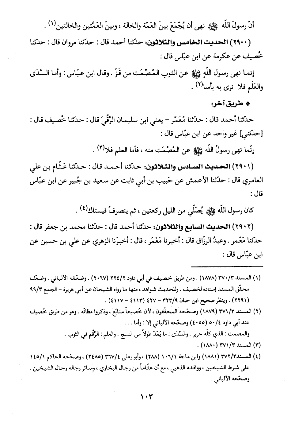 (٤) المسند ٣/ ٣٧٢ (١٨٨١) وابن ماجة ٦/ ١٠١ (٢٨٨)، وأبو يعلى ٤/ ٣٦٧ (٢٤٨٥)، وصحّحه الحاكم ٥/ ١٤١ على شرط الشيخين، ووافقه الذهبي، مع أن عثّامًا من رجال البخاري، وسائر رجاله رجال الشيخين. وصحّحه الألباني.