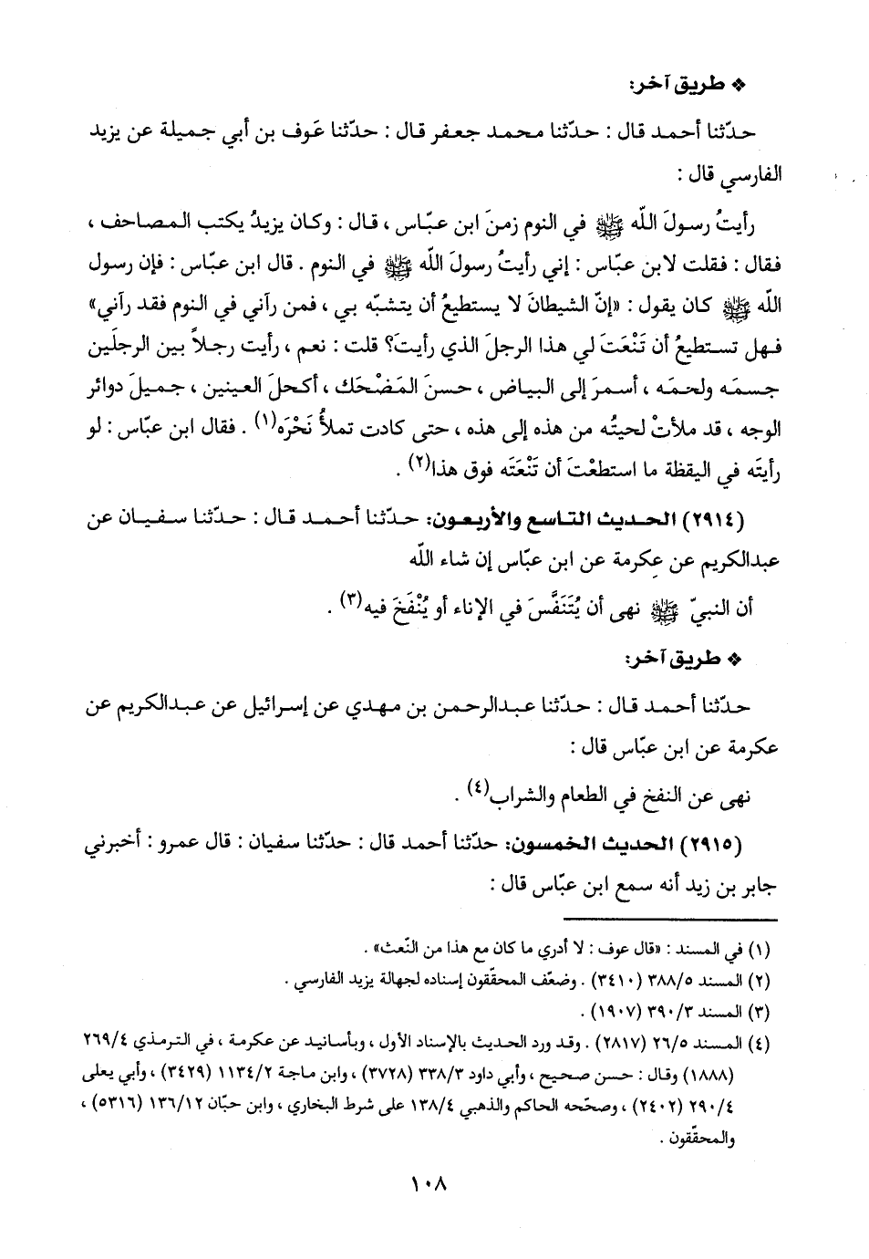 رأيتُ رسولَ اللَّه -صلى اللَّه عليه وسلم- في النوم زمنَ ابن عبّاس، قال: وكان يزيدُ يكتب المصاحف، فقال: فقلت لابن عبّاس: إني رأيتُ رسولَ اللَّه -صلى اللَّه عليه وسلم- في النوم. قال ابن عبّاس: فإن رسول اللَّه -صلى اللَّه عليه وسلم- كان يقول: "إنّ الشيطانَ لا يستطيعُ أن يتشبّه بي، فمن رآني في النوم فقد رآني" فهل تستطيعُ أن تَنْعَتَ لي هذا الرجلَ الذي رأيتَ؟ قلت: نعم، رأيت رجلًا بين الرجلَين جسمَه ولحمَه، أسمرَ إلى البياض، حسنَ المَضْحَك، أكحلَ العينين، جميلَ دوائر الوجه، قد ملأتْ لحيتُه من هذه إلى هذه، حتى كادت تملأُ نَحْرَه (١). فقال ابن عبّاس: لو رأيتَه في اليقظة ما استطعْتَ أن تَنْعَتَه فوق هذا (٢).