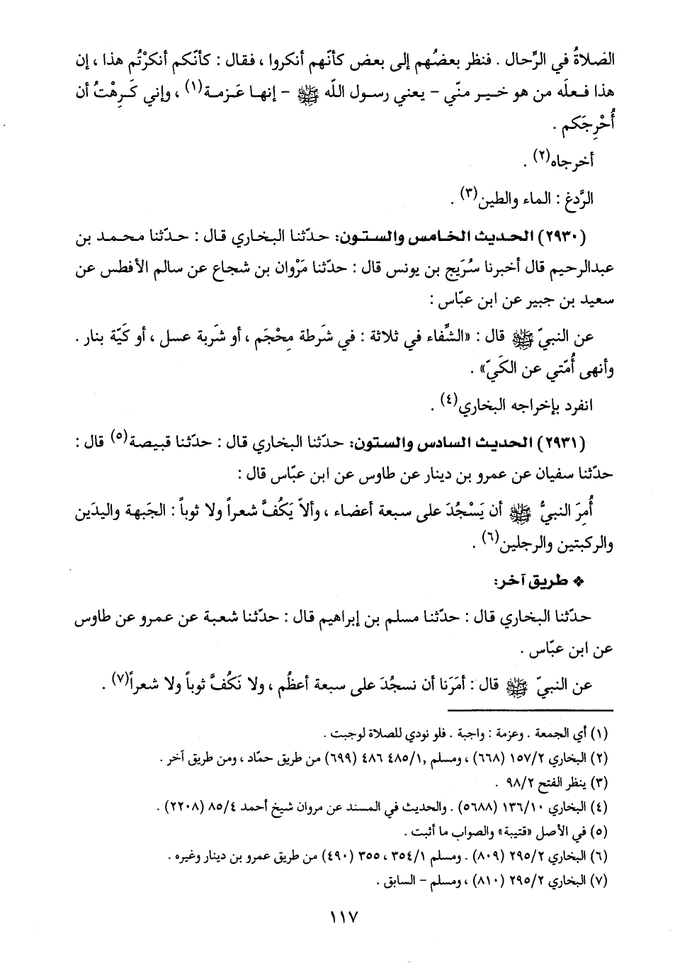 عن النبيّ -صلى اللَّه عليه وسلم- قال: أمَرَنا أن نسجُدَ على سبعة أعظُم، ولا نَكُفَّ ثوبًا ولا شعرًا (٧).
