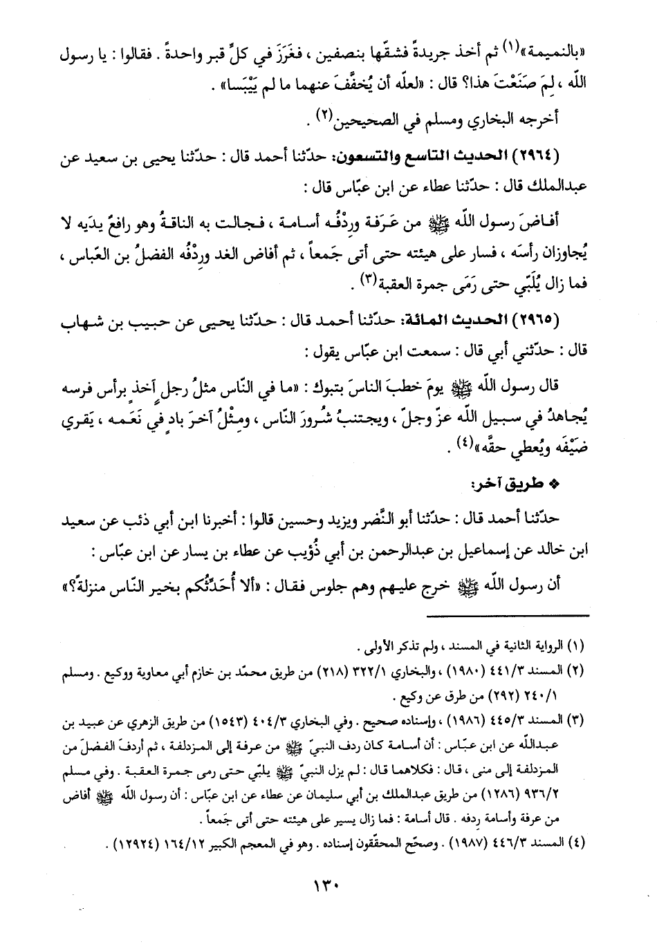 (٣) المسند ٣/ ٤٤٥ (١٩٨٦)، وإسناده صحيح. وفي البخاري ٣/ ٤٠٤ (١٥٤٣) من طريق الزهري عن عبيد بن عبد اللَّه عن ابن عبّاس: أن أسامة كان ردف النبيّ -صلى اللَّه عليه وسلم- من عرفة إلى المزدلفة، ثم أردفَ الفضلَ من المزدلفة إلى منى، قال: فكلاهما قال: لم يزل النبيّ -صلى اللَّه عليه وسلم- يلبّي حتى رمى جمرة العقبة. وفي مسلم ٢/ ٩٣٦ (١٢٨٦) من طريق عبد الملك بن أبي سليمان عن عطاء عن ابن عبّاس: أن رسول اللَّه -صلى اللَّه عليه وسلم- أفاض من عرفة وأسامة رِدفه. قال أسامة: فما زال يسير على هيئته حتى أتى جَمعًا.