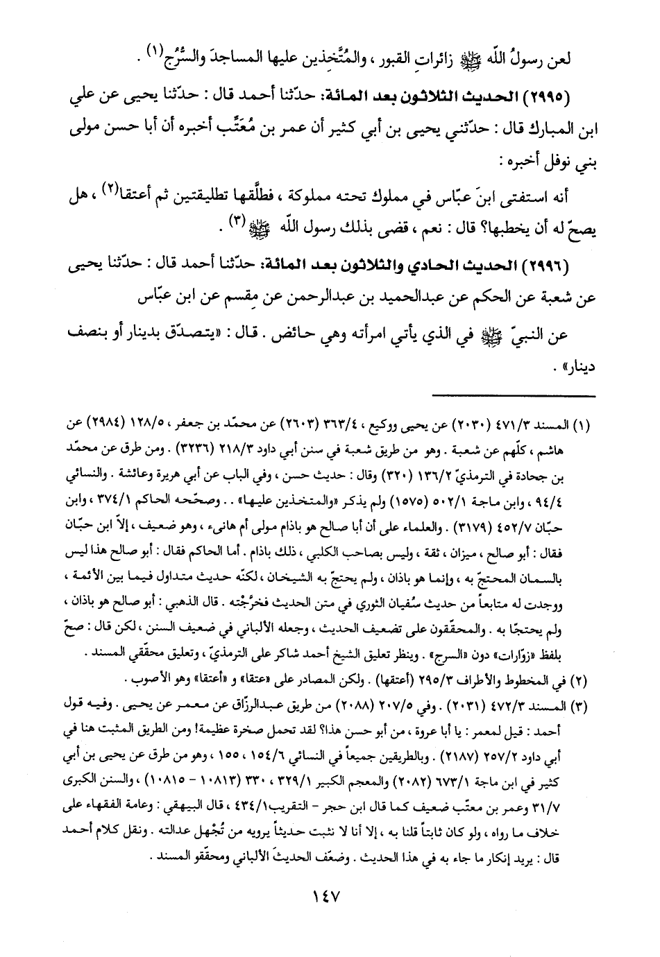 (١) المسند ٣/ ٤٧١ (٢٠٣٠) عن يحيى ووكيع، ٤/ ٣٦٣ (٢٦٠٣) عن محمّد بن جعفر، ٥/ ١٢٨ (٢٩٨٤) عن هاشم، كلّهم عن شعبة. وهو من طريق شعبة في سنن أبي داود ٣/ ٢١٨ (٣٢٣٦). ومن طرق عن محمّد بن جحادة في الترمذيّ ٢/ ١٣٦ (٣٢٠) وقال: حديث حسن، وفي الباب عن أبي هريرة وعائشة. والنسائي ٤/ ٩٤، وابن ماجة ١/ ٥٠٢ (١٥٧٥) ولم يذكر "والمتخذين عليها". . وصحّحه الحاكم ١/ ٣٧٤، وابن حبّان ٧/ ٤٥٢ (٣١٧٩). والعلماء على أن أبا صالح هو باذام مولى أم هانىء، وهو ضعيف، إلّا ابن حبّان فقال: أبو صالح، ميزان، ثقة، وليس بصاحب الكلبي، ذلك باذام. أما الحاكم فقال: أبو صالح هذا ليس بالسمان المحتجّ به، وإنما هو باذان، ولم يحتجّ به الشيخان، لكنه حديث متداول فيما بين الأئمة، ووجدت له متابعًا من حديث سُفيان الثوري في متن الحديث فخرَّجْته. قال الذهبي: أبو صالح هو باذان، ولم يحتجّا به. والمحقّقون على تضعيف الحديث، وجعله الألباني في ضعيف السنن، لكن قال: صحّ بلفظ "زوّارات" دون "السرج". وينظر تعليق الشيخ أحمد شاكر على الترمذيّ، وتعليق محقّقي المسند.