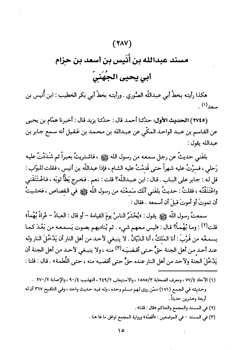 (٢٨٧) مسند عبد اللَّه بن أُنَيس بن أسعد بن حِزام أبي يحيى الجُهَنِيّ
