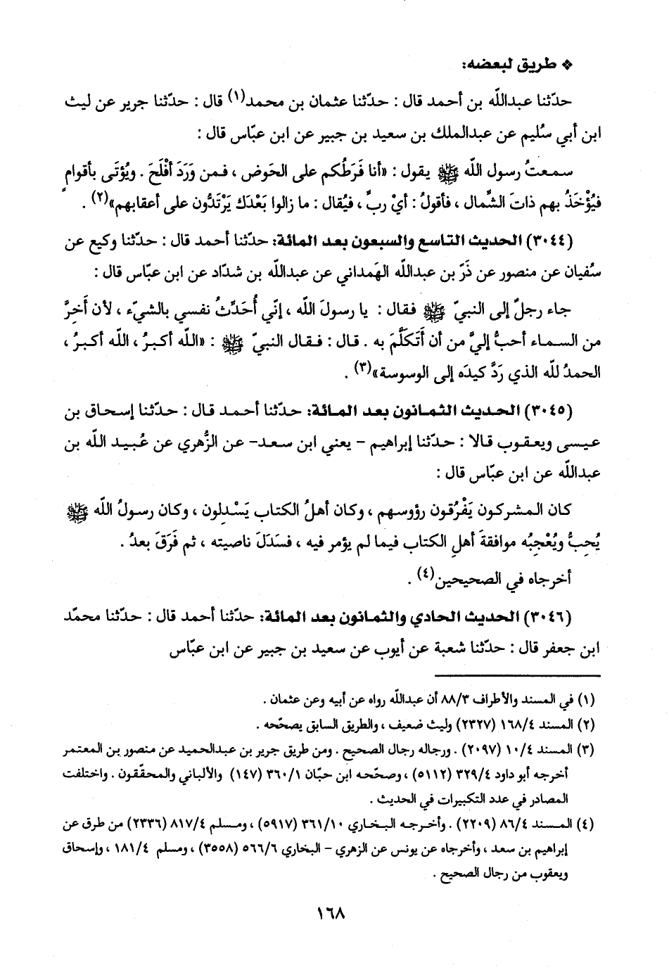 (٣٠٤٥) الحديث الثمانون بعد المائة: حدّثنا أحمد قال: حدّثنا إسحاق بن عيسى ويعقوب قالا: حدّثنا إبراهيم -يعني ابن سعد- عن الزُّهري عن عُبيد اللَّه بن عبد اللَّه عن ابن عبّاس قال: