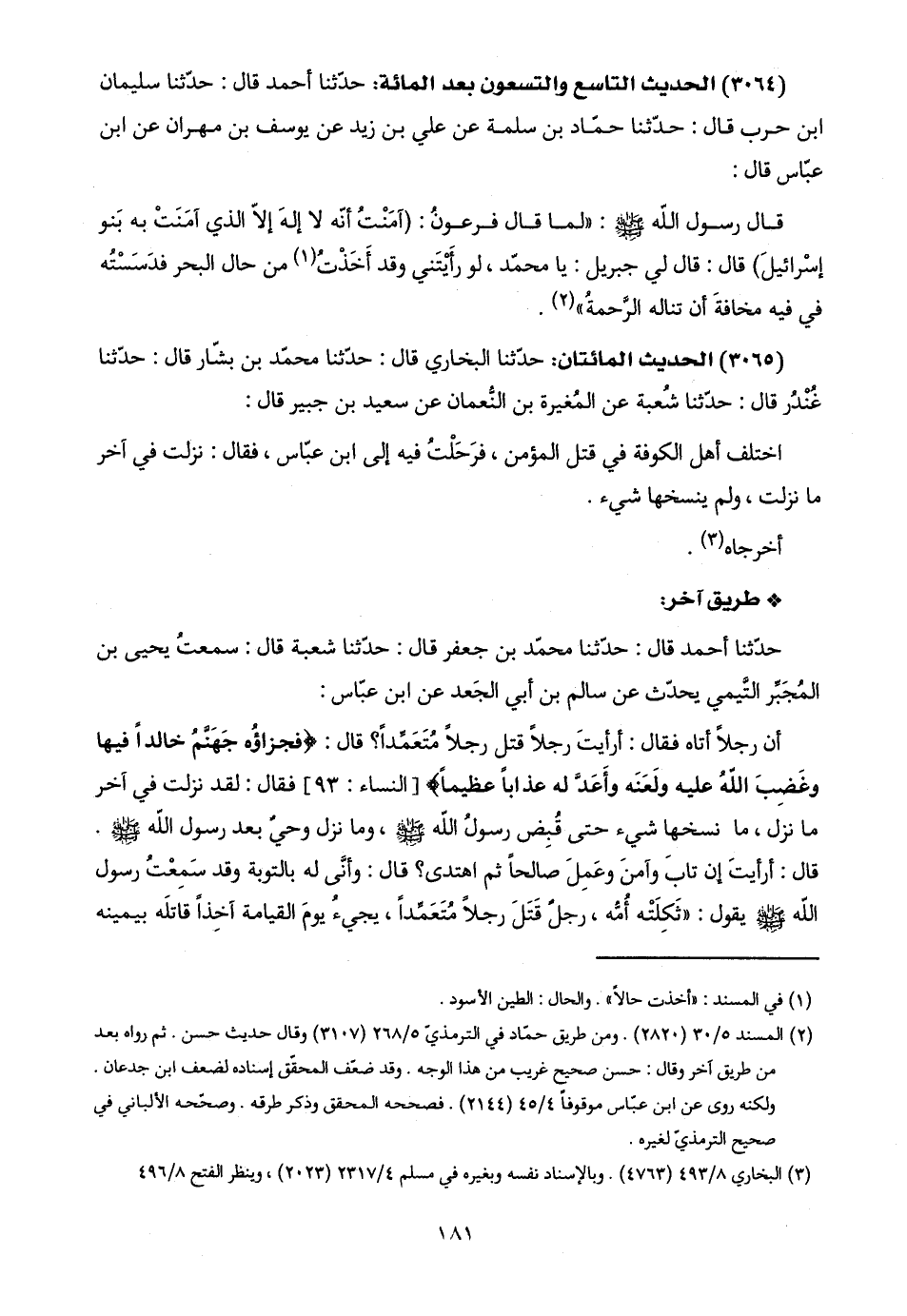 (٣٠٦٤) الحديث التاسع والتسعون بعد المائة: حدّثنا أحمد قال: حدّثنا سليمان ابن حرب قال: حدّثنا حمّاد بن سلمة عن علي بن زيد عن يوسف بن مهران عن ابن عبّاس قال: