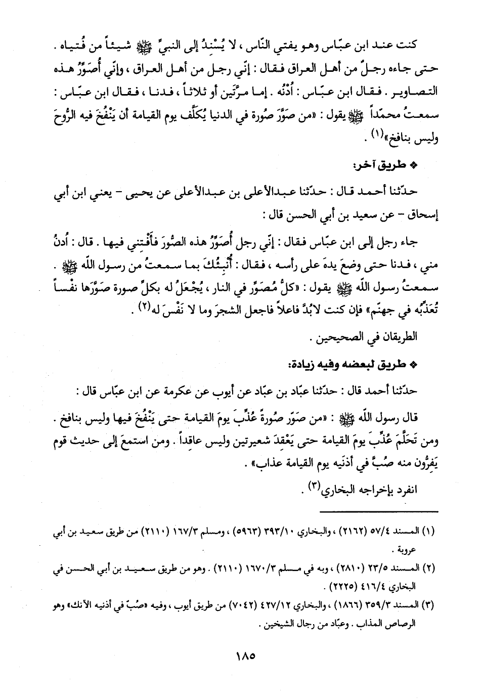 كنت عند ابن عبّاس وهو يفتي النّاس، لا يُسْنِدُ إلى النبيِّ -صلى اللَّه عليه وسلم- شيئًا من فُتياه. حتى جاءه رجلٌ من أهل العراق فقال: إنّي رجل من أهل العراق، وإنّي أُصَوِّرُ هذه التصاوير. فقال ابن عبّاس: ادْنُه. إما مرّتَين أو ثلاثًا، فدنا، فقال ابن عبّاس: سمعتُ محمّدًا -صلى اللَّه عليه وسلم- يقول: "من صَوَّرَ صُورة في الدنيا يُكَلَّف يوم القيامة أن يَنْفُخَ فيه الرُّوحَ وليس بنافخ" (١).