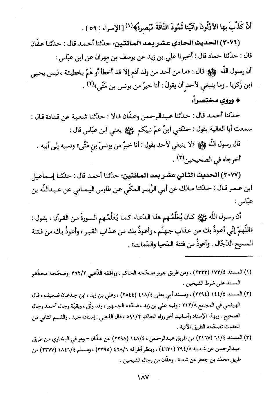 (٣٠٧٦) الحديث الحادي عشر بعد المائتين: حدّثنا أحمد قال: حدّثنا عفّان قال: حدّثنا حماد قال: أخبرنا علي بن زيد عن يوسف بن مِهران عن ابن عبّاس: