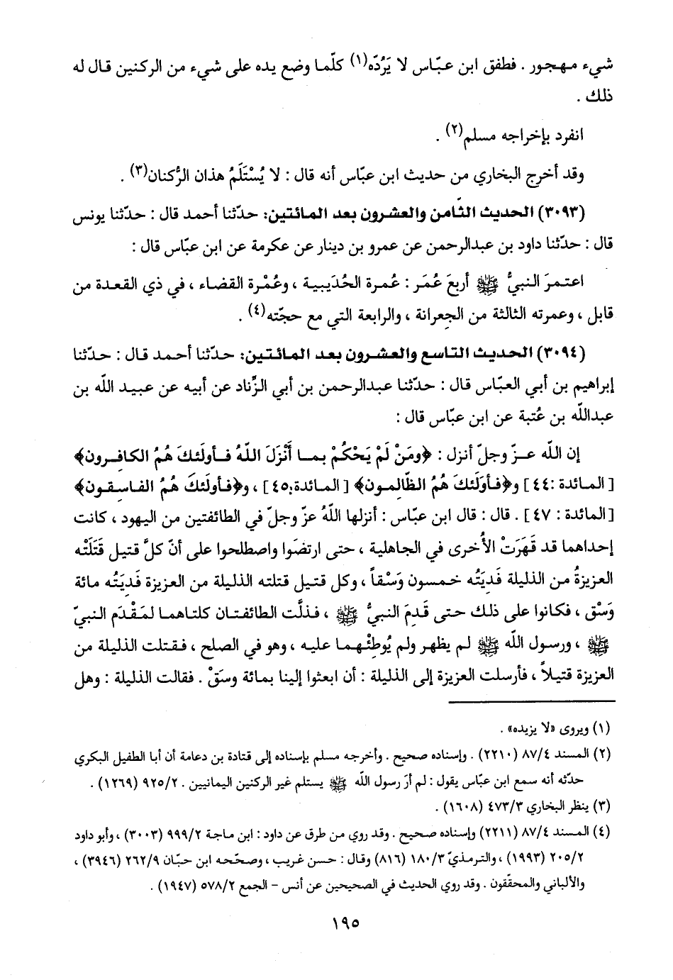 إنّ اللَّه عزّ وجلّ أنزل: {وَمَنْ لَمْ يَحْكُمْ بِمَا أَنْزَلَ اللَّهُ فَأُولَئِكَ هُمُ الْكَافِرُونَ} [المائدة: ٤٤] و {فَأُولَئِكَ هُمُ الظَّالِمُونَ} [المائدة: ٤٥]، و {فَأُولَئِكَ هُمُ الْفَاسِقُونَ} [المائدة: ٤٧]. قال: قال ابن عبّاسَ: أنزلها اللَّهُ عزّ وجلّ في الطائفتين من اليهود، كانت إحداهما قد قَهَرَتْ الأُخرى في الجاهلية، حتى ارتضَوا واصطلحوا على أنّ كلَّ قتيل قَتَلَتْه العزيزةُ من الذليلة فَدِيَتُه خمسون وَسْقًا، وكل قتيل قتلته الذليلة من العزيزة فَدِيَتُه مائة وَسْق، فكانوا على ذلك حتى قَدِمَ النبيُّ -صلى اللَّه عليه وسلم-، فذلَّت الطائفتان كلتاهما لمَقْدَم النبيّ -صلى اللَّه عليه وسلم-، ورسول اللَّه -صلى اللَّه عليه وسلم- لم يظهر ولم يُوطِئْهما عليه، وهو في الصلح، فقتلت الذليلة من العزيزة قتيلًا، فأرسلت العزيزة إلى الذليلة: أن ابعثوا إلينا بمائة وسَقْ. فقالت الذليلة: وهل