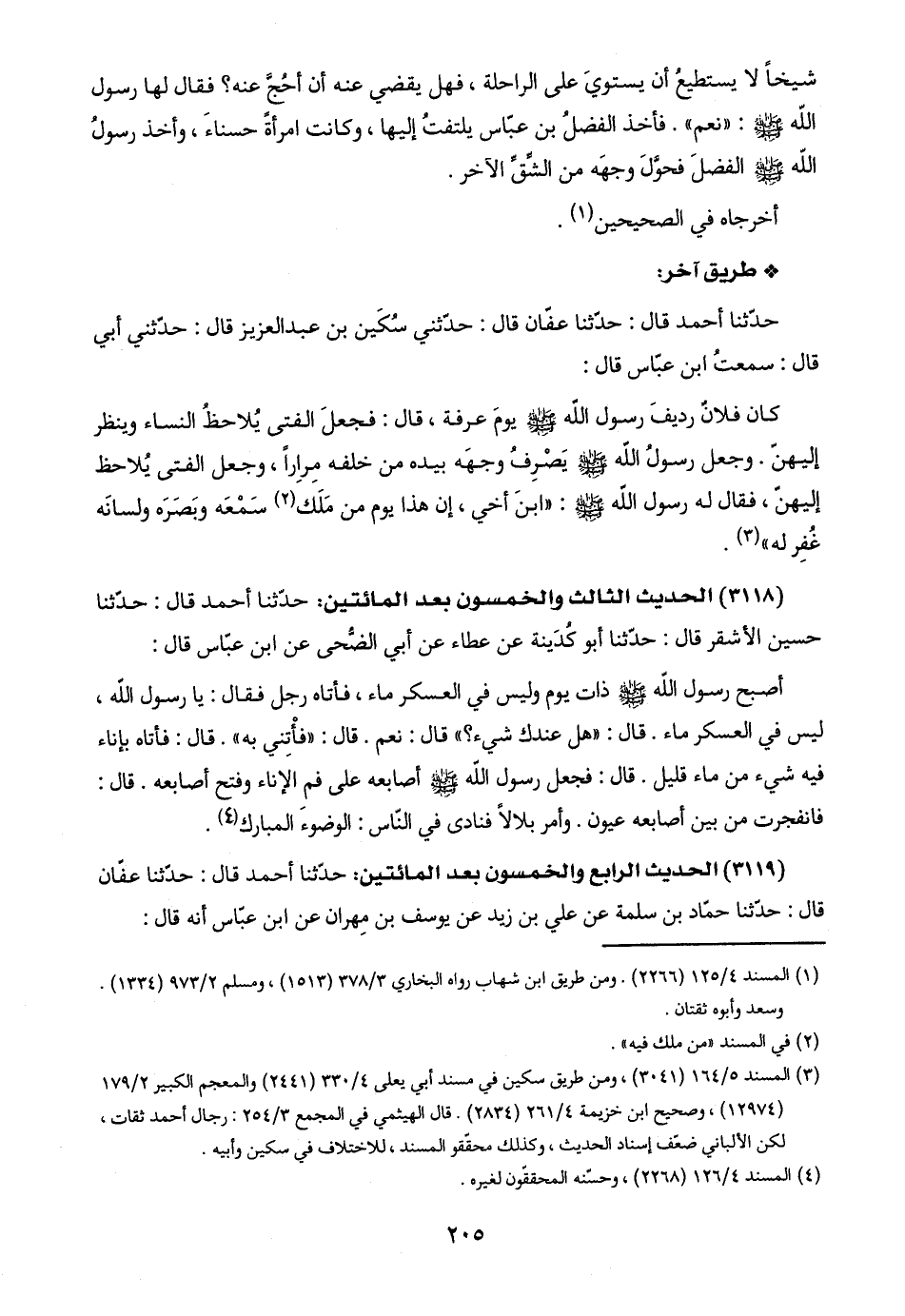 (٣١١٩) الحديث الرابع والخمسون بعد المائتين: حدّثنا أحمد قال: حدّثنا عفّان قال: حدّثنا حمّاد بن سلمة عن علي بن زيد عن يوسف بن مِهران عن ابن عبّاس أنّه قال: