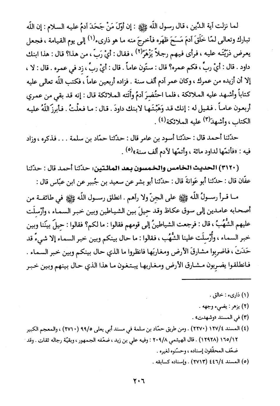 حدّثنا أحمد قال: حدّثنا أسود بن عامر قال: حدّثنا حمّاد بن سلمة. . . فذكره، وزاد فيه: "فأتمّها لداود مائة، وأتمّها لآدم ألف سنة" (٥).