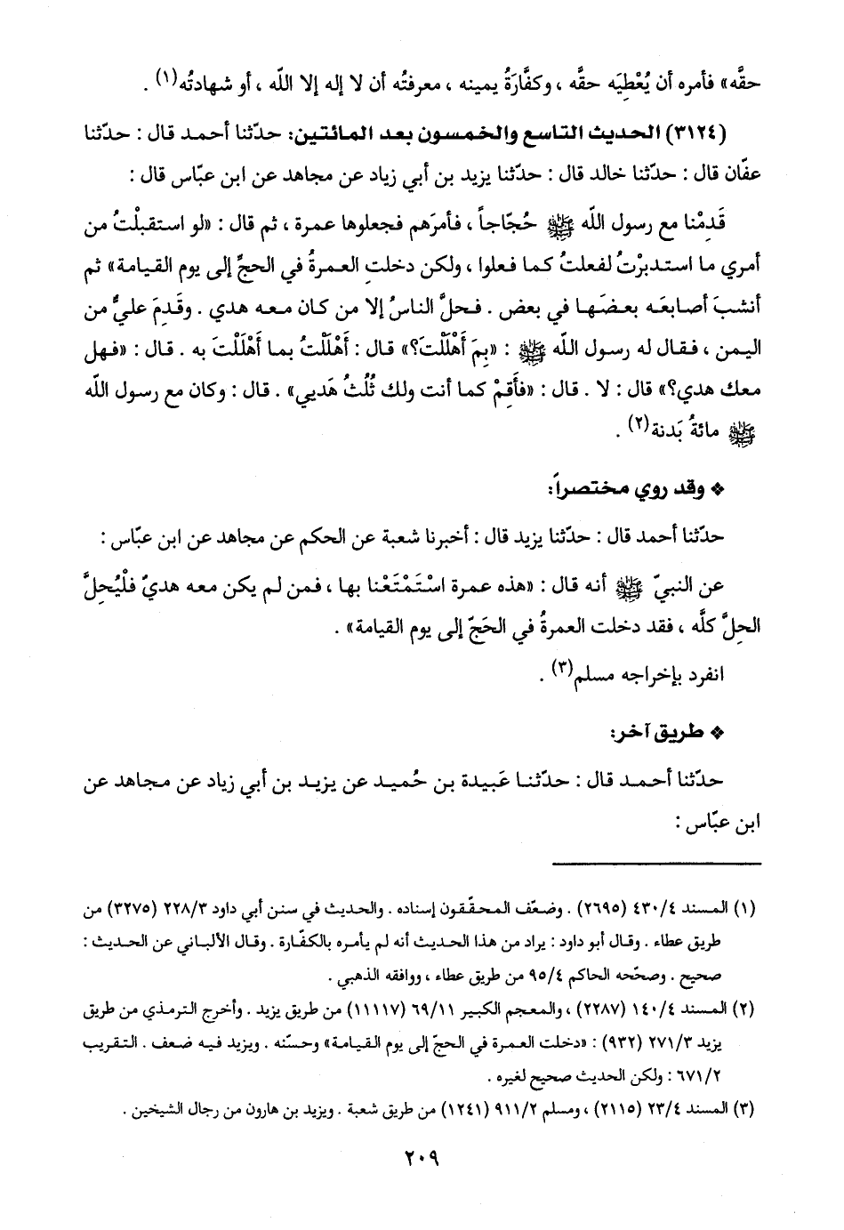 (٣١٢٤) الحديث التاسع والخمسون بعد المائتين: حدّثنا أحمد قال: حدّثنا عفّان قال: حدّثنا خالد قال: حدّثنا يزيد بن أبي زياد عن مجاهد عن ابن عبّاس قال: