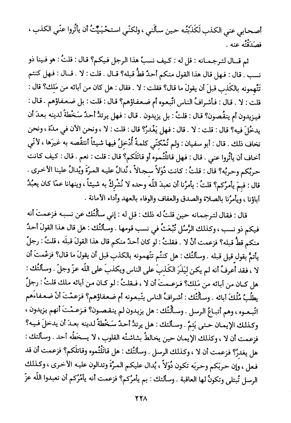 قال: فقال لترجمانه حين قلتُ له ذلك: قل له: إني سألْتُك عن نسبه فزعمتَ أنّه فيكم ذو نسب، وكذلك الرُّسُل تُبْعَثُ في نسب قومها. وسألتُك: هل قال هذا القولَ أحدٌ منكم قطُّ قبله؟ فزعمت أنْ لا. فقلتُ: لو كان أحدٌ منكم قال هذا القولَ قبلَه، قلتُ: رجلٌ يأتمُّ بقولٍ قيل قبله. وسألتُك: هل كنتُم تتّهمونه بالكذب قبل أن يقولَ ما قال؟ فزعْمتَ أن لا، فقد أعرفُ أنّه لم يكن لِيَذَرَ الكَذِبَ على النّاس ويكذبَ على اللَّه عزّ وجلّ. وسألتُك: هل كان من آبائه من مَلِك؟ فزعمتَ أن لا، فقلتُ: لو كان من آبائه ملك قلتُ: رجلٌ يطلُبُ مُلْكَ آبائه. وسألْتُك: أشرافُ النّاس يتّبعونه أم ضعفاؤهم؟ فزعمْتَ أنّ ضعفاءَهم اتّبعوه، وهم أتباعُ الرسل. وسألْتُك: هل يزيدون لم ينقصون؟ فزعمْتَ أنهم يزيدون، وكذلك الإيمان حتى يَتِمَّ. وسألتك: هل يرتدُّ أحدٌ سَخْطةً لدينه بعدَ أن يدخلَ فيه؟ فزعمت أن لا، وكذلك الإيمان حين يخالطُ بشاشتُه القلوب، لا يسخَطُه أحد. وسألتك: هل يغدِرُ؟ فزعمت أن لا، وكذلك الرسل. وسألتُك: هل قاتَلْتموه وقاتلَكم؟ فزعمت أن قد فعل، وإن حربَكم وحربَه تكون دُوَلًا، يُدال عليكم المرَّةَ وتدالون عليه الأخرى، وكذلك الرسل تُبتلى وتكونُ لها العاقبة. وسألتك: بم يأمرُكم؟ فزعمت أنّه يأمُرُكم أن تعبدوا اللَّه عزّ