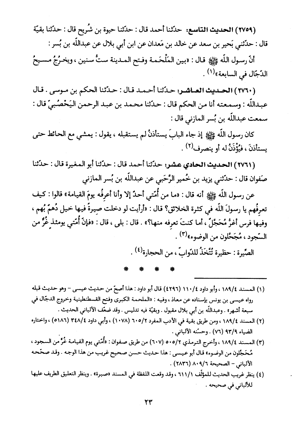 (٢٧٥٩) الحديث التاسع: حدّثنا أحمد قال: حدّثنا حيوة بن شُريح قال: حدّثنا بقيّة قال: حدّثني بَحير بن سعد عن خالد بن مَعدان عن ابن أبي بلال عن عبد اللَّه بن بُسر:
