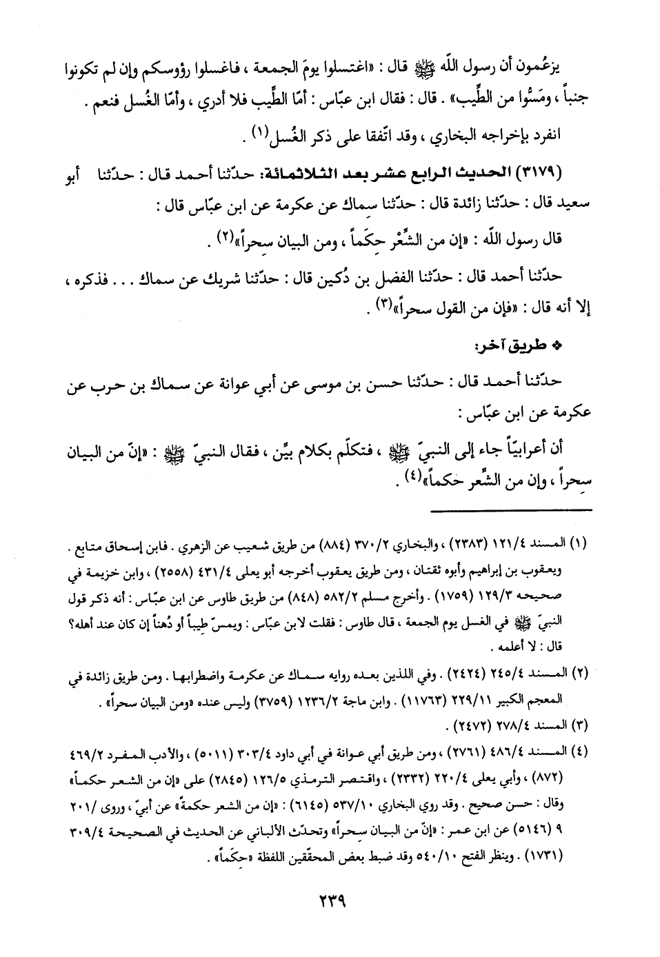 (٢) المسند ٤/ ٢٤٥ (٢٤٢٤). وفي اللذين بعده روايه سماك عن عكرمة واضطرابها. ومن طريق زائدة في المعجم الكبير ١١/ ٢٢٩ (١١٧٦٣). وابن ماجة ٢/ ١٢٣٦ (٣٧٥٩) وليس عنده "ومن البيان سحرًا".