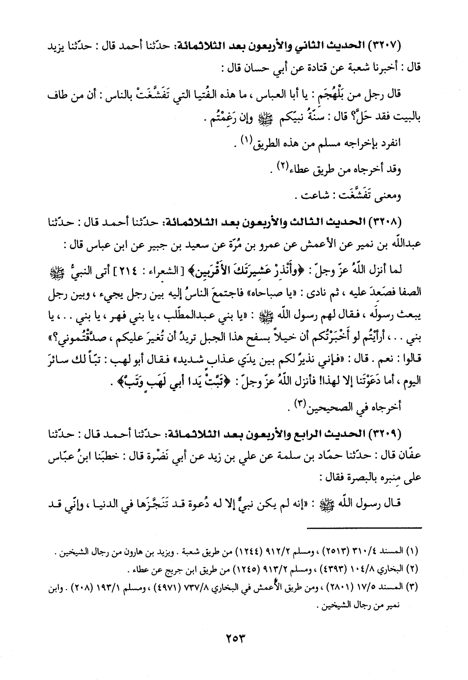 (٣٢٠٨) الحديث الثالث والأربعون بعد الثلاثمائة: حدّثنا أحمد قال: حدّثنا عبد اللَّه بن نمير عن الأعمش عن عمرو بن مُرّة عن سعيد بن جبير عن ابن عباس قال: