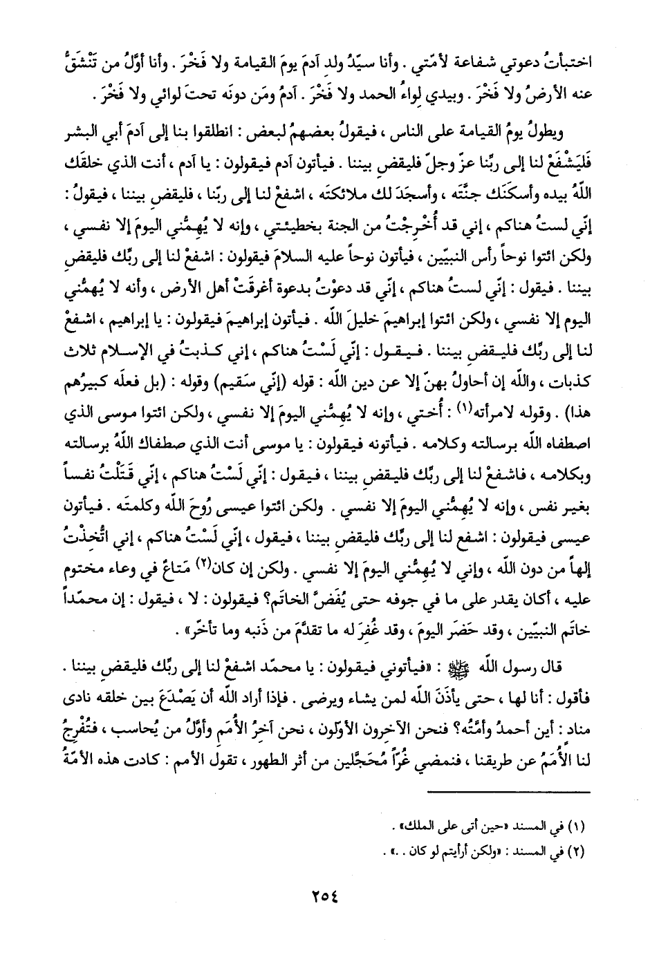 ويطولُ يومُ القيامة على النّاس، فيقولُ بعضهمُ لبعض: انطلقوا بنا إلى آدمَ أبي البشر فَليَشْفَعْ لنا إلى ربِّنا عزّ وجلّ فليقضِ بيننا. فيأتون آدم فيقولون: يا آدم، أنت الذي خلقَك اللَّهُ بيده وأسكَنَك جنَّتَه، وأسجَدَ لك ملائكتَه، اشفعْ لنا إلى ربّنا، فليقضِ بيننا، فيقولُ: إنّي لستُ هناكم، إني قد أُخْرِجْتُ من الجنّة بخطيئتي، وإنه لا يُهِمُّني اليومَ إلا نفسي، ولكن ائتوا نوحًا رأس النبيّين، فيأتون نوحًا عليه السلامَ فيقولون: اشفعْ لنا إلى ربِّك فليقضِ بيننا. فيقول: إنّي لستُ هناكم، إنّي قد دعوْتُ بدعوة أغرقَتْ أهل الأرض، وأنه لا يُهمُّني اليوم إلا نفسي، ولكن ائتوا إبراهيمَ خليلَ اللَّه. فيأتون إبراهيمَ فيقولون: يا إبراهيم، اشفعْ لنا إلى ربِّك فليقضِ بيننا. فيقول: إنّي لَسْتُ هناكم، إني كذبتُ في الإسلام ثلاث كذبات، واللَّه إن أحاولُ بهنّ إلا عن دين اللَّه: قوله (إنّي سَقيم) وقوله: (بل فعلَه كبيرُهم هذا). وقوله لامرأته (١): أُختي، وإنه لا يُهِمُّني اليومَ إلا نفسي، ولكن ائتوا موسى الذي اصطفاه اللَّه برسالته وكلامه. فيأتونه فيقولون: يا موسى أنت الذي صطفاك اللَّهُ برسالته وبكلامه، فاشفعْ لنا إلى ربِّك فليقضِ بيننا، فيقول: إنّي لَسْتُ هناكم، إنّي قَتَلْتُ نفسًا بغير نفس، وإنه لا يُهِمُّني اليومَ إلا نفسي. ولكن ائتوا عيسى رُوحَ اللَّه وكلمتَه. فيأتون عيسى فيقولون: اشفع لنا إلى ربِّك فليقضِ بيننا، فيقول، إنّي لَسْتُ هناكم، إني اتُّخِذْتُ إلهًا من دون اللَّه، وإني لا يُهِمُّني اليومَ إلا نفسي. ولكن إن كان (٢) مَتاعٌ في وعاء مختوم عليه، أكان يقدر على ما في جوفه حتى يُفَضَّ الخاتَم؟ فيقولون: لا، فيقول: إن محمّدًا خاتَم النبيّين، وقد حَضَر اليومَ، وقد غُفِرَ له ما تقدَّمَ من ذَنبه وما تأخّر".