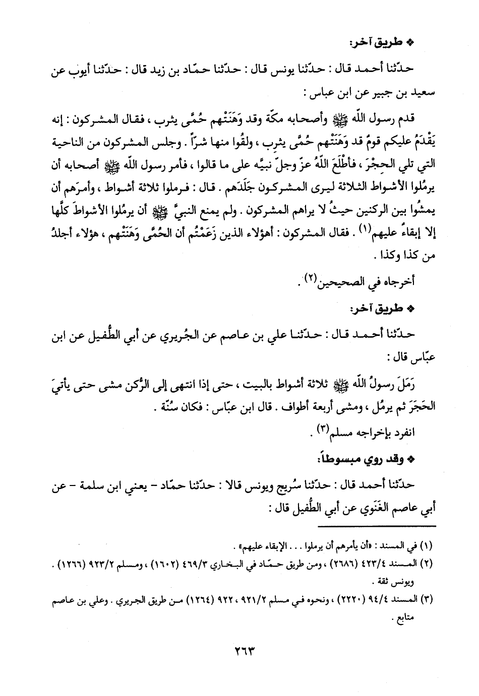 رَمَلَ رسولُ اللَّه -صلى اللَّه عليه وسلم- ثلاثة أشواط بالبيت، حتى إذا انتهى إلى الرُّكن مشى حتى يأتيَ الحَجَرَ ثم يرمُل، ومشى أربعة أطواف. قال ابن عبّاس: فكان سُنّة.