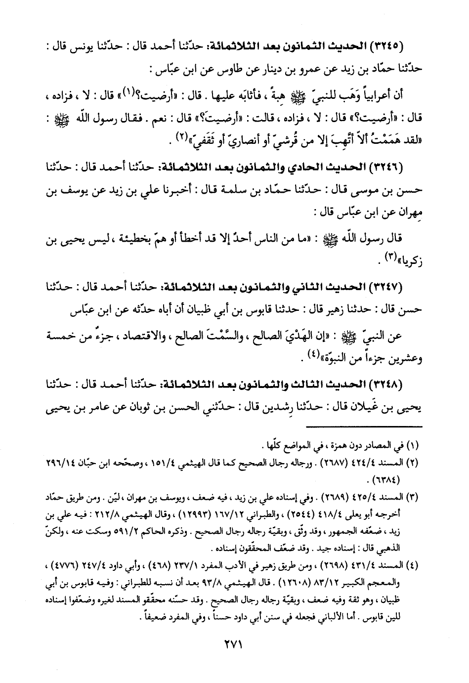 (٣٢٤٦) الحديث الحادي والثمانون بعد الثلاثمائة: حدّثنا أحمد قال: حدّثنا حسن بن موسى قال: حدّثنا حمّاد بن سلمة قال: أخبرنا علي بن زيد عن يوسف بن مِهران عن ابن عبّاس قال: