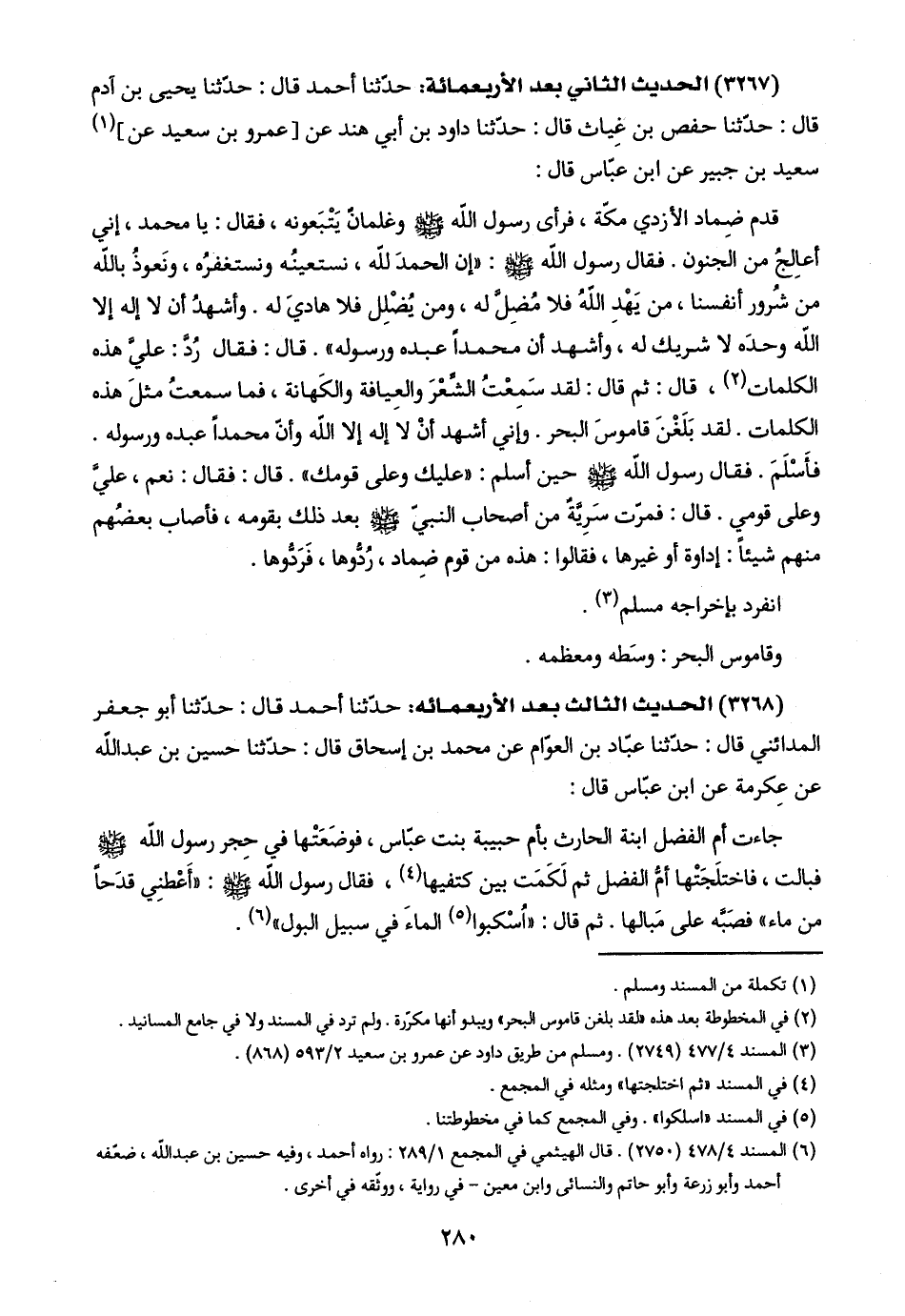 (٦) المسند ٤/ ٤٧٨ (٢٧٥٠). قال الهيثمي في المجمع ١/ ٢٨٩: رواه أحمد، وفيه حسين بن عبد اللَّه، ضعّفه أحمد وأبو زرعة وأبو حاتم والنسائي وابن معين - في رواية، ووثّقه في أخرى.