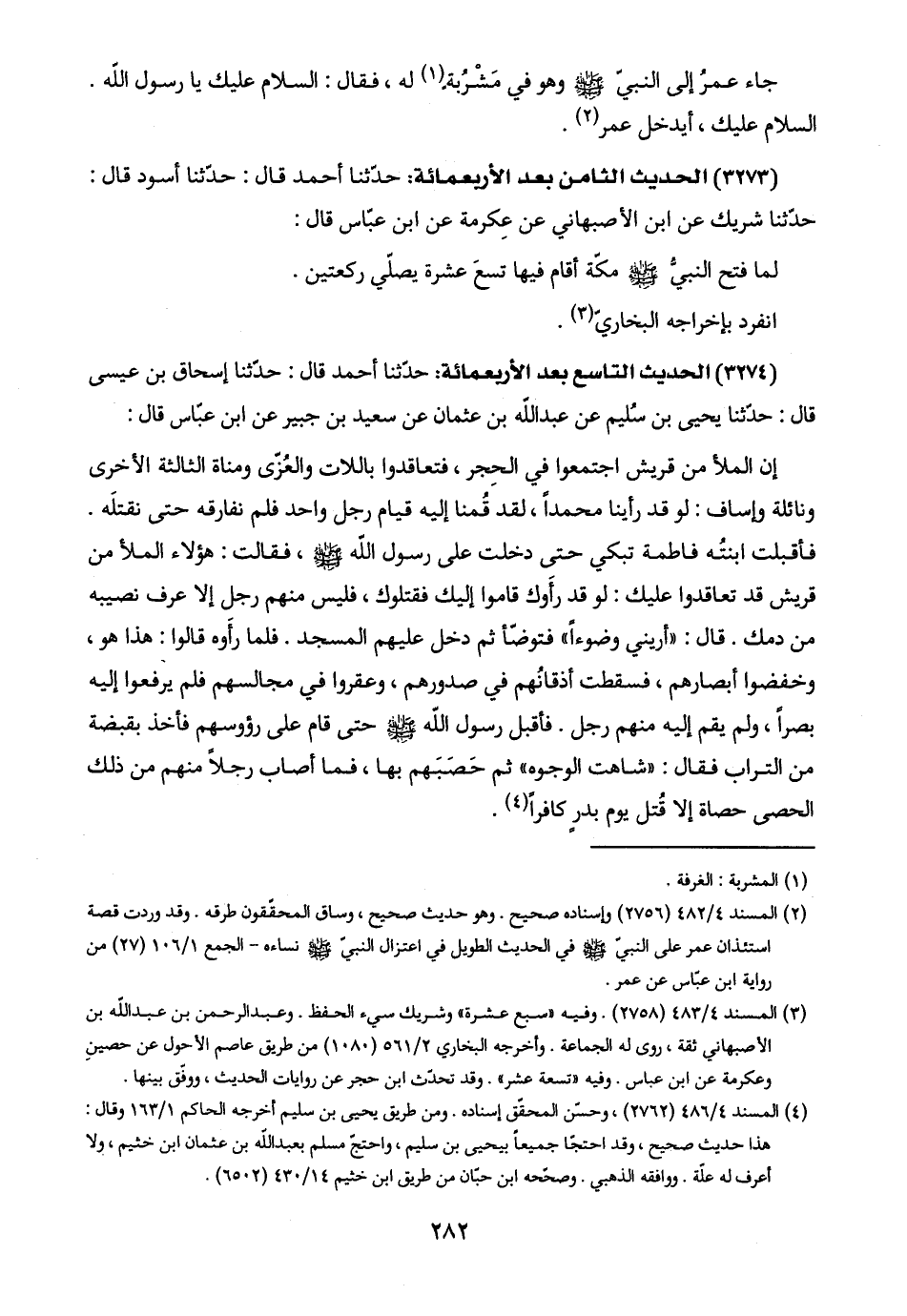 (٢) المسند ٤/ ٤٨٢ (٢٧٥٦) وإسناده صحيح. وهو حديث صحيح، وساق المحقّقون طرقه. وقد وردت قصة استئذان عمر على النبيّ -صلى اللَّه عليه وسلم- في الحديث الطويل في اعتزال النبيّ -صلى اللَّه عليه وسلم- نساءه - الجمع ١/ ١٠٦ (٢٧) من رواية ابن عبّاس عن عمر.