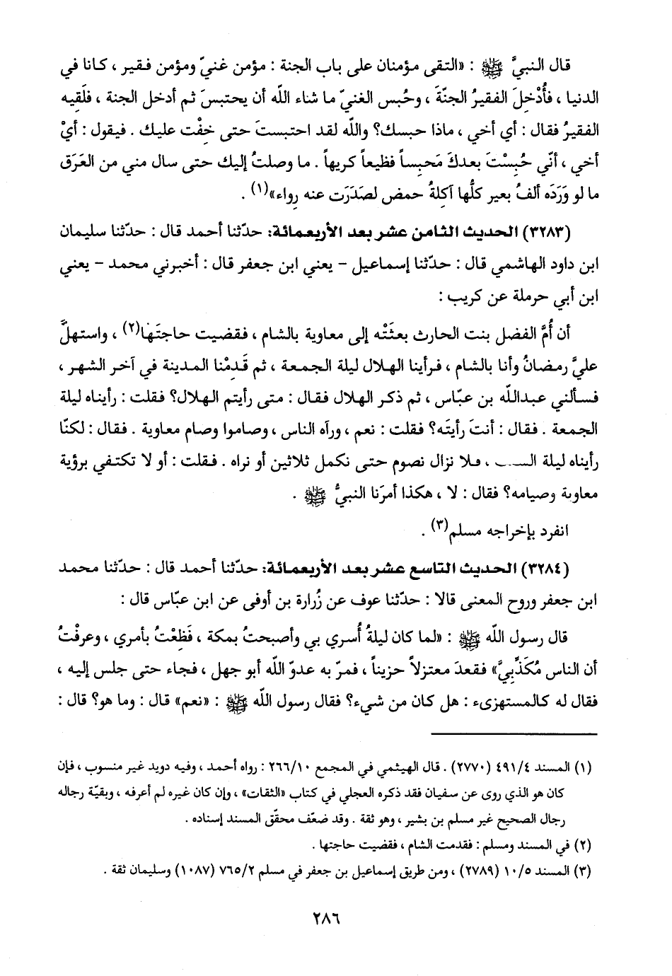 (٣٢٨٣) الحديث الثامن عشر بعد الأربعمائة: حدّثنا أحمد قال: حدّثنا سليمان ابن داود الهاشمي قال: حدّثنا إسماعيل - يعني ابن جعفر قال: أخبرني محمد - يعني ابن أبي حرملة عن كريب:
