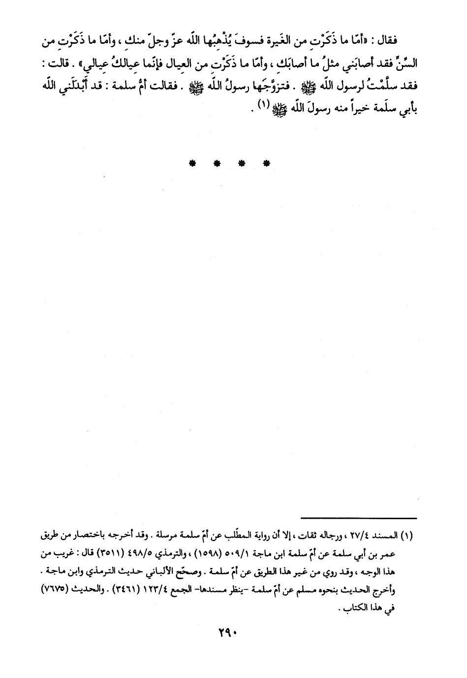 فقال: "أمَّا ما ذَكَرْتِ من الغَيرة فسوفَ يُذْهِبُها اللَّه عزّ وجلّ منكِ، وأمّا ما ذَكَرْتِ من السِّنِّ فقد أصابَني مثلُ ما أصابَكِ، وأمّا ما ذَكَرْتِ من العِيال فإنَّما عِيالكُ عِيالي". قالت: فقد سلَّمْتُ لرسول اللَّه -صلى اللَّه عليه وسلم-. فتزوَّجَها رسولُ اللَّه -صلى اللَّه عليه وسلم-. فقالت أمُّ سلمة: قد أَبْدَلَني اللَّه بأبي سلَمة خيرًا منه رسولَ اللَّه -صلى اللَّه عليه وسلم- (١).