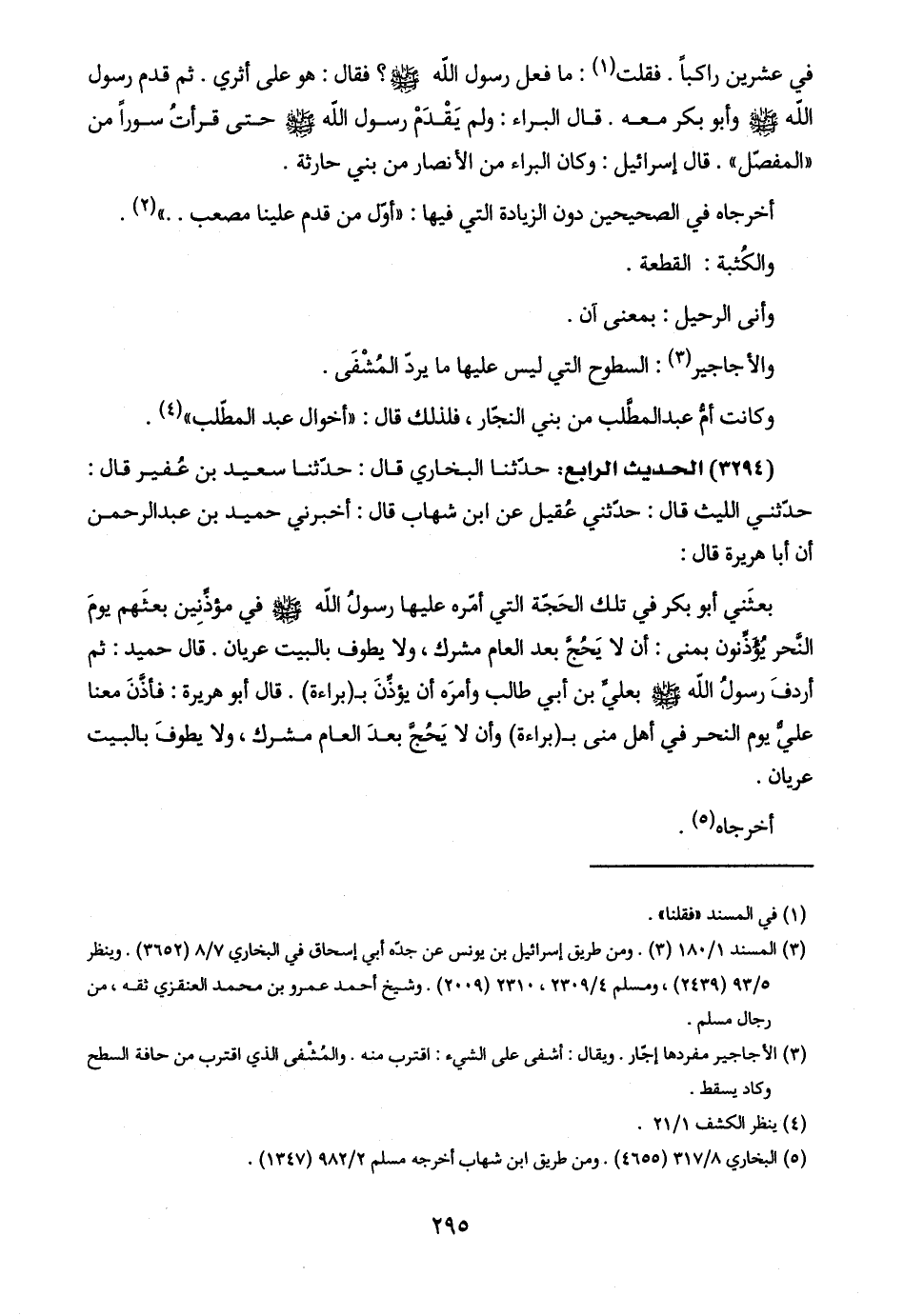 بعثَني أبو بكر في تلك الحَجَّة التي أمّره عليها رسولُ اللَّه -صلى اللَّه عليه وسلم- في مؤذِّنِين بعثَهم يومَ النَّحر يُؤَذِّنُون بمنى: أن لا يَحُجَّ بعد العام مشرك، ولا يطوف بالبيت عريان. قال حميد: ثم أردفَ رسولُ اللَّه -صلى اللَّه عليه وسلم- بعليِّ بن أبي طالب وأمرَه أن يؤذِّنَ بـ (براءة). قال أبو هريرة: فأذَّنَ معنا عليٌّ يوم النحر في أهل منى بـ (براءة) وأن لا يَحُجَّ بعدَ العام مشرك، ولا يطوفَ بالبيت عريان.