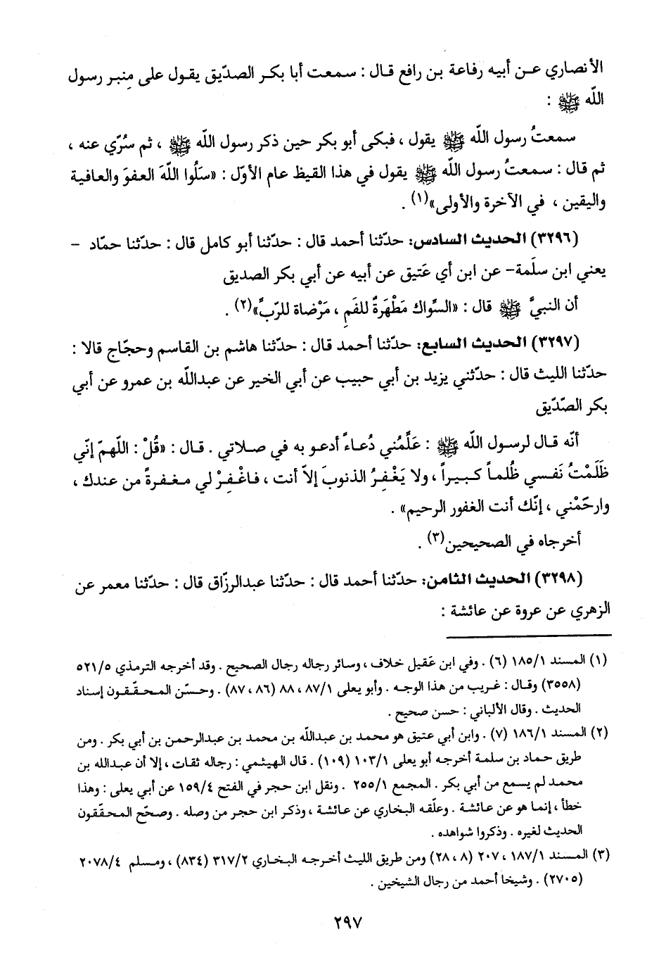(٣٢٩٧) الحديث السابع: حدّثنا أحمد قال: حدّثنا هاشم بن القاسم وحجّاج قالا: حدّثنا الليث قال: حدّثني يزيد بن أبي حبيب عن أبي الخير عن عبد اللَّه بن عمرو عن أبي بكر الصِّدِّيق: