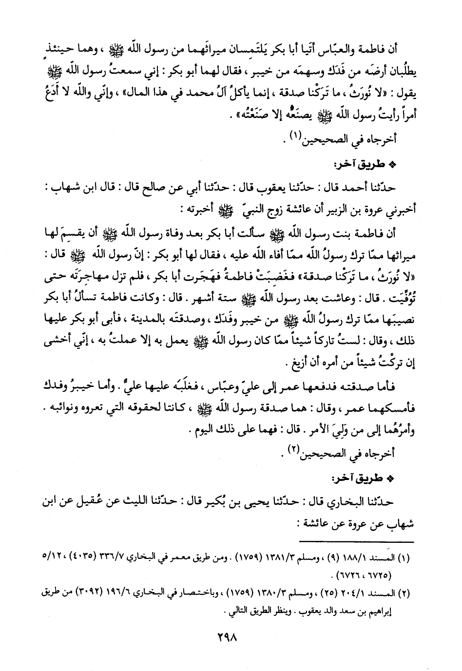 أن فاطمة بنت رسول اللَّه -صلى اللَّه عليه وسلم- سألت أبا بكر بعد وفاة رسول اللَّه -صلى اللَّه عليه وسلم- أن يقسِمَ لها ميراثها ممّا ترك رسولُ اللَّه ممّا أفاء اللَّه عليه، فقال لها أبو بكر: إنّ رسول اللَّه -صلى اللَّه عليه وسلم- قال: "لا نُورَثُ، ما تَرَكْنا صدقة" فغَضِبَتْ فاطمةُ فهَجَرت أبا بكر، فلم تزل مهاجِرَتَه حتى تُوُفِّيَت. قال: وعاشت بعد رسول اللَّه -صلى اللَّه عليه وسلم- ستة أشهر. قال: وكانت فاطمة تسأل أبا بكر نصيبَها ممَّا ترك رسولُ اللَّه -صلى اللَّه عليه وسلم- من خيبر وفَدَك، وصدقتَه بالمدينة، فأبى أبو بكر عليها ذلك، وقال: لستُ تاركًا شيئًا ممَّا كان رسول اللَّه -صلى اللَّه عليه وسلم- يعمل به إلَّا عملتُ به، إنّي أخشى إنّ تركْتُ شيئًا من أمره أن أزيغ.
